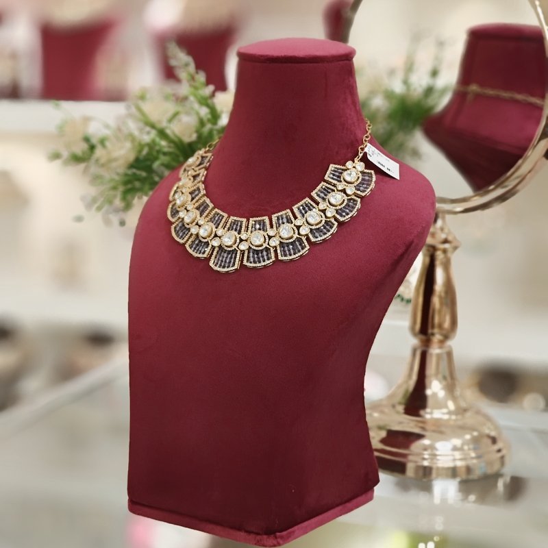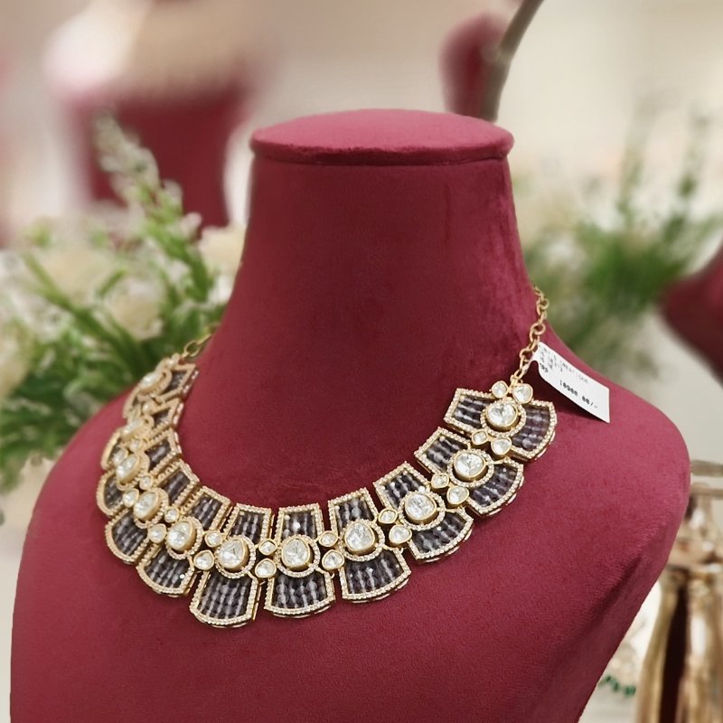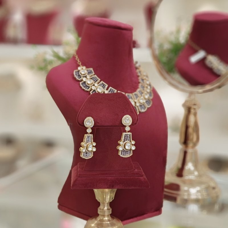 The jewelry set has been crafted by a skilled designer using exquisite polki and cz stones. Adding to its unique beauty, the set features tiny purple beads that have been carefully strung in between the pieces.