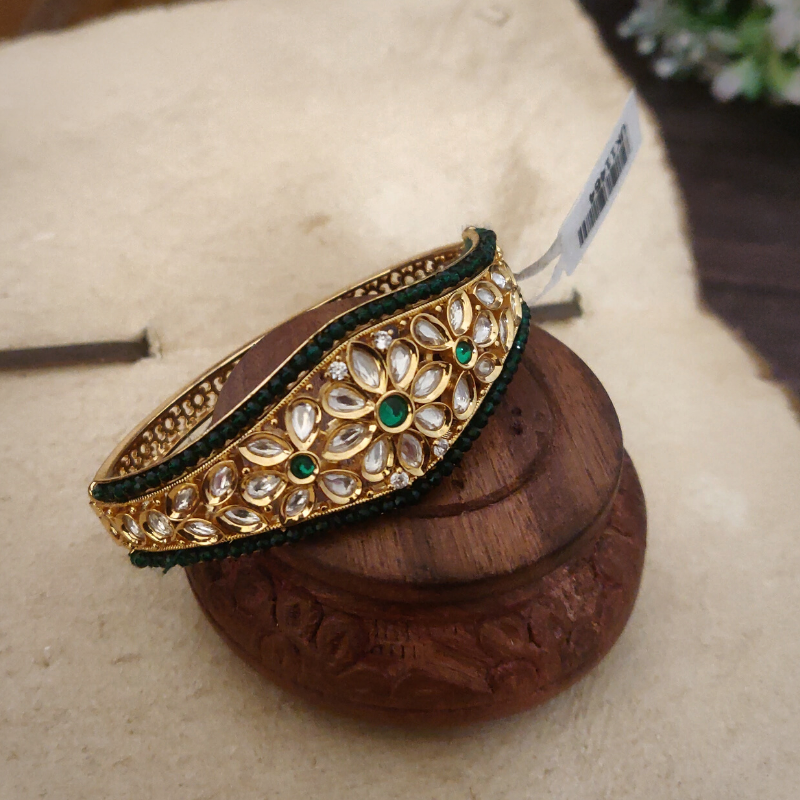 Crafted with a stunning combination of polki and green pota stones, this bracelet is delicately plated with 22-karat gold. The back features intricate jali work that adds to the overall elegance of the piece.