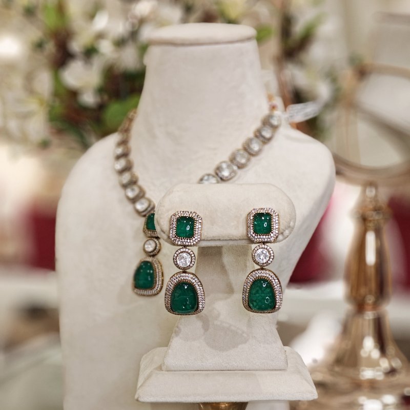 This necklace set is incredibly adaptable and is crafted using polki stones and cz, encircling deep green stones that are coated in a 18 kt gold hue.