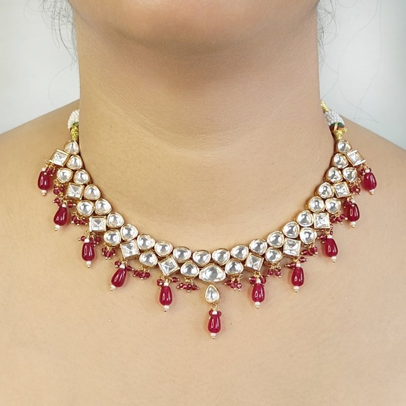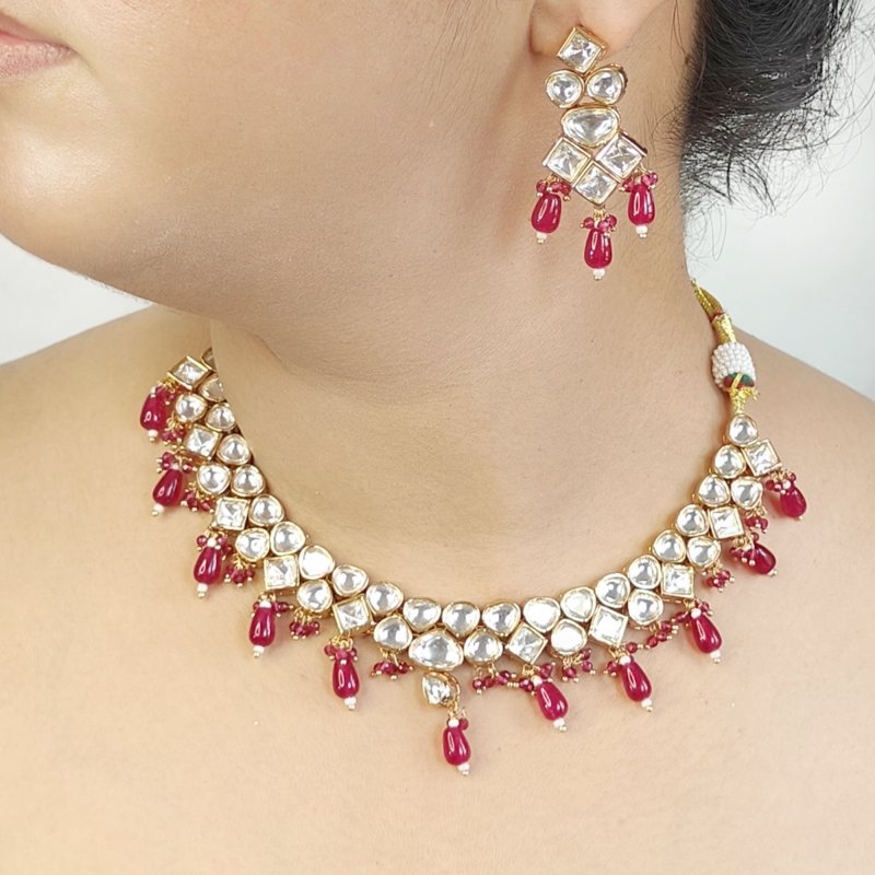 This Beautiful necklace set, adorned with cz polki beaded with ruby coloured beads , plated in 18 kt gold