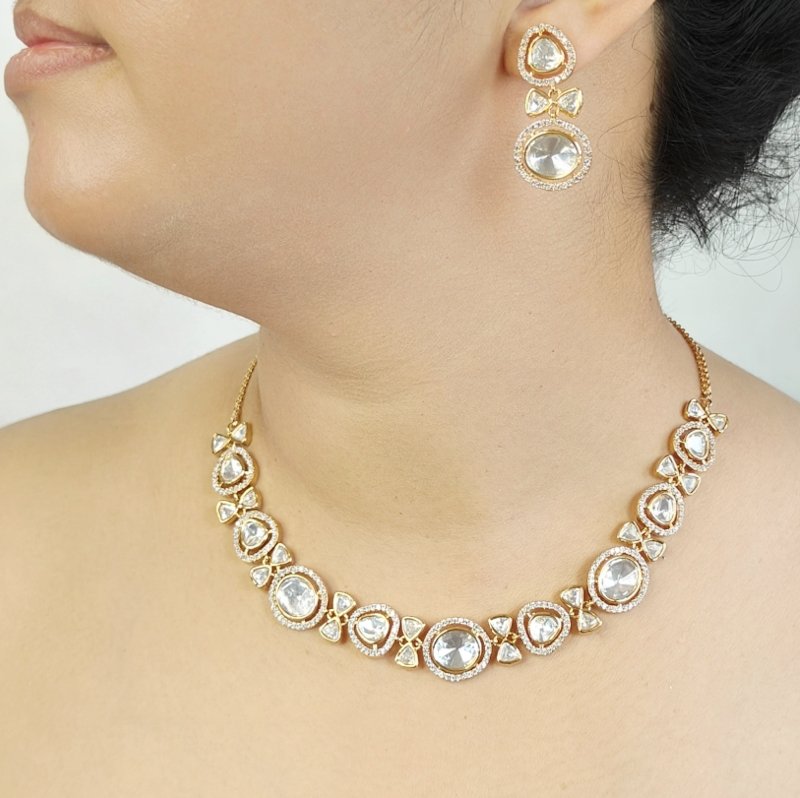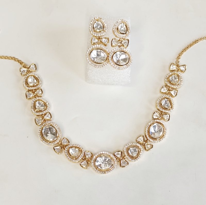 This elegant single neckline set features uncut Polki stones, plated in a rich 18kt gold color. A truly sophisticated and timeless piece, perfect for adding a touch of luxury to any ensemble.