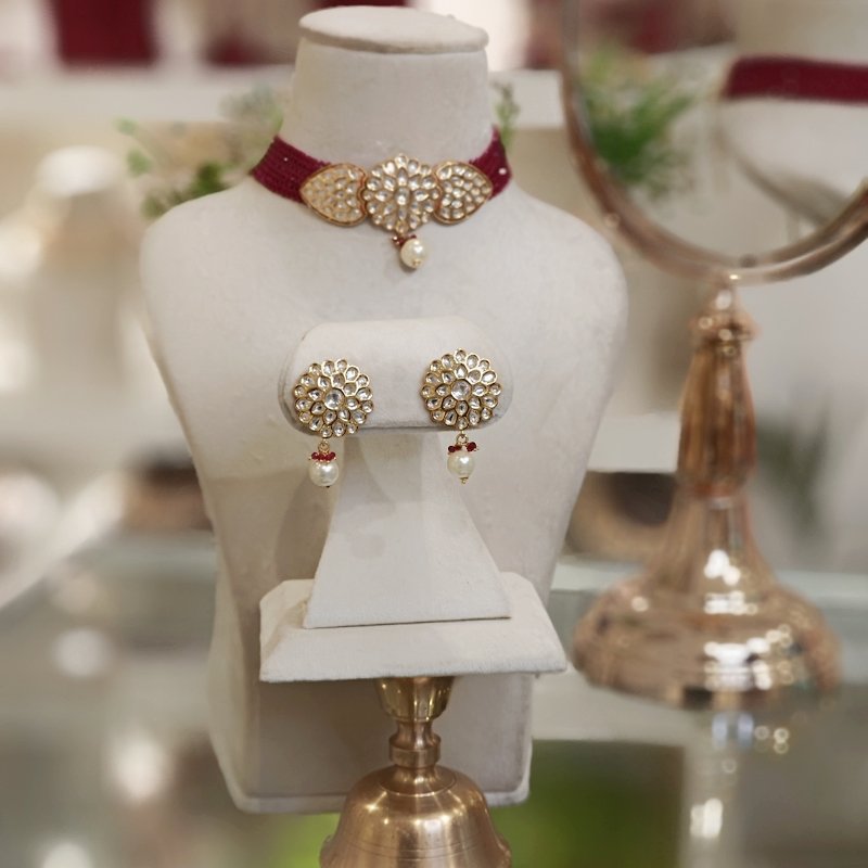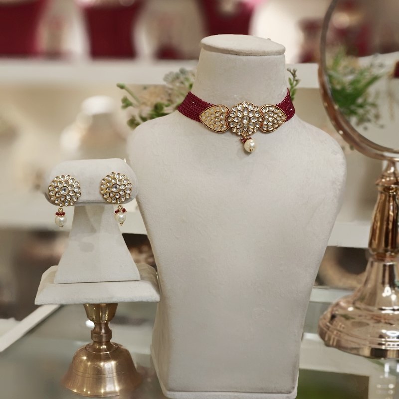 Ekantika choker set is Crafted with artificial polki stones, plated in 18 kt gold is adorned with a single pearl drop and maroon beaded necklace.