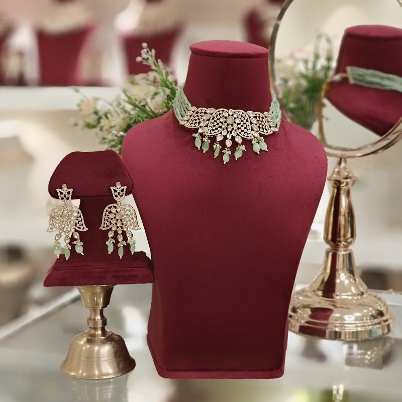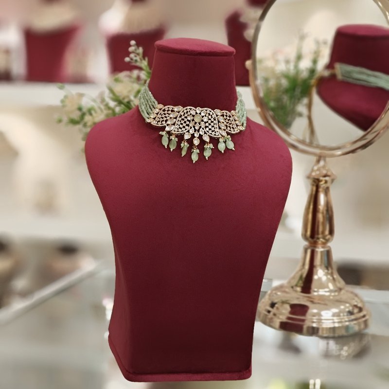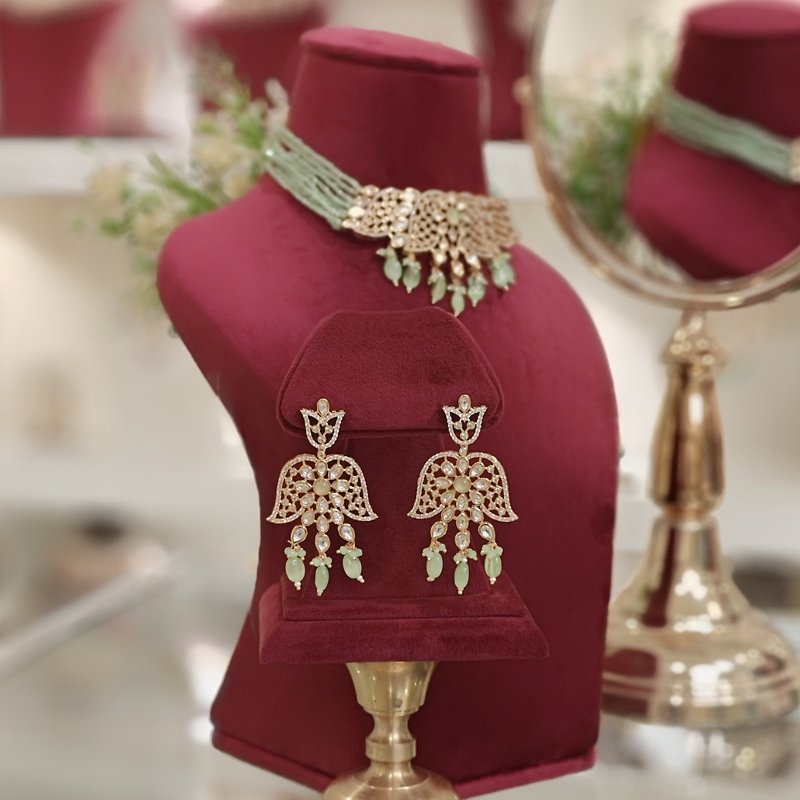 This choker set is plated with 22 kt gold and features cz and polki stones, as well as a mint green pota stone and faceted green hydro beads. The accompanying earrings are long and equipped with screw backs.
