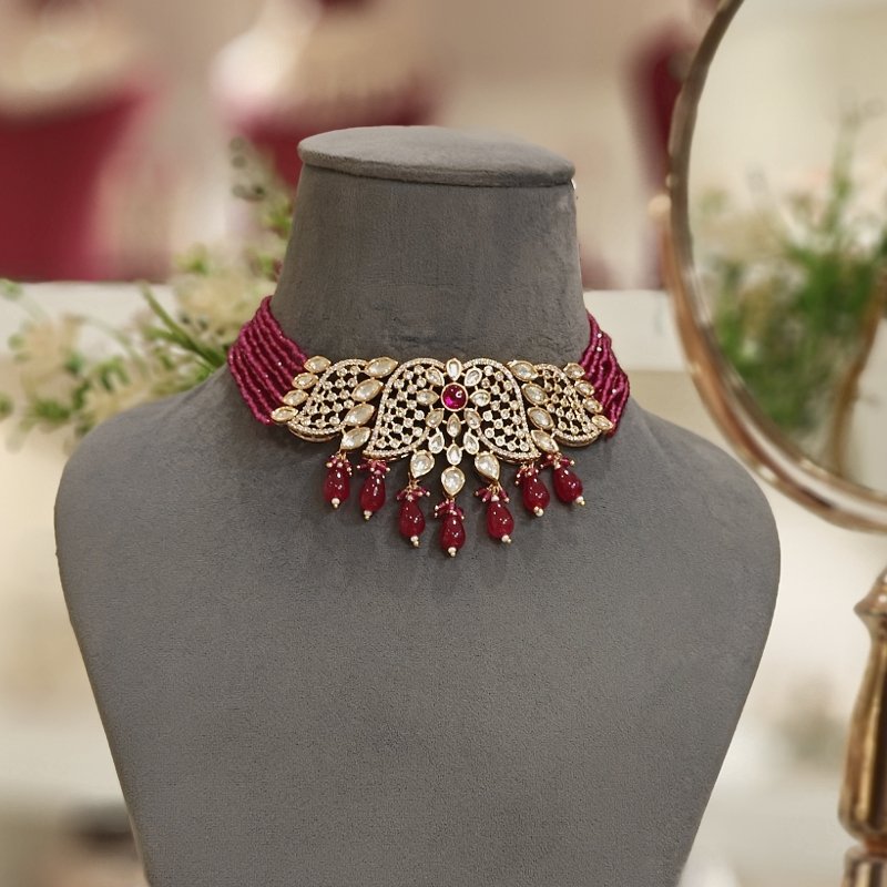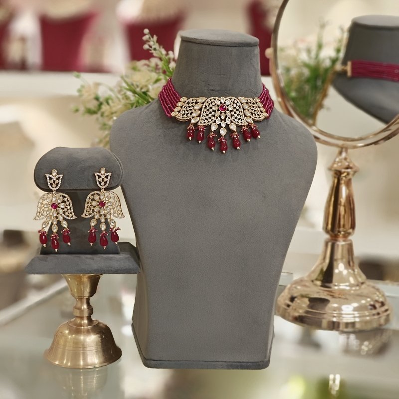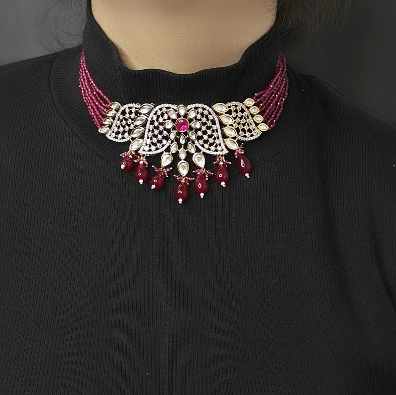 This choker set is plated with 22 kt gold and features cz and polki stones, as well as a ruby pota stone and faceted ruby hydro beads. The accompanying earrings are long and equipped with screw backs.