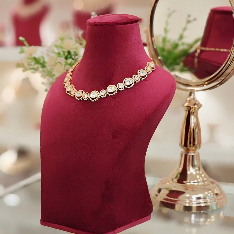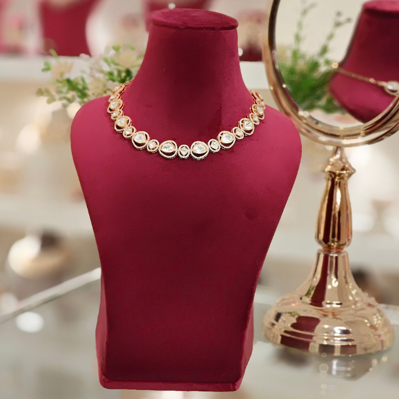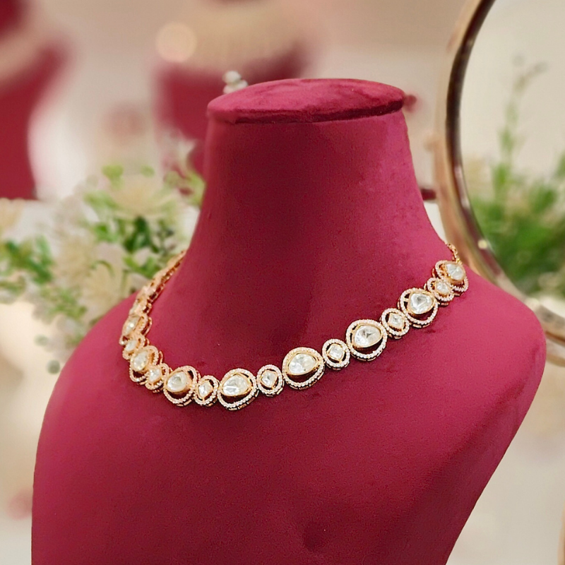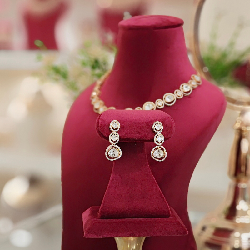 The chic neckline of this piece is crafted from uncut polki stones and encircled by micro-set CZ stones with earrings , all plated in a lustrous 18 kt gold hue