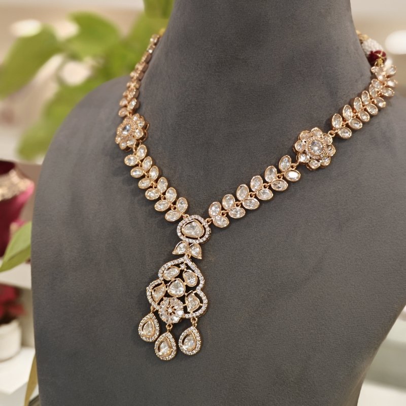 This stunning uncut Polki pendant set features a mid-length design, elegantly paired with matching earrings. The pieces are beautifully studded with clear uncut polki stones and sparkling cubic zirconia (CZ), creating a perfect blend of traditional and contemporary charm.