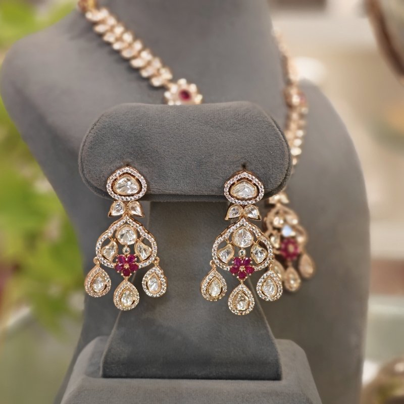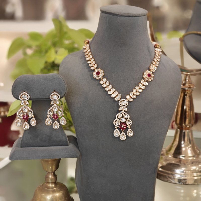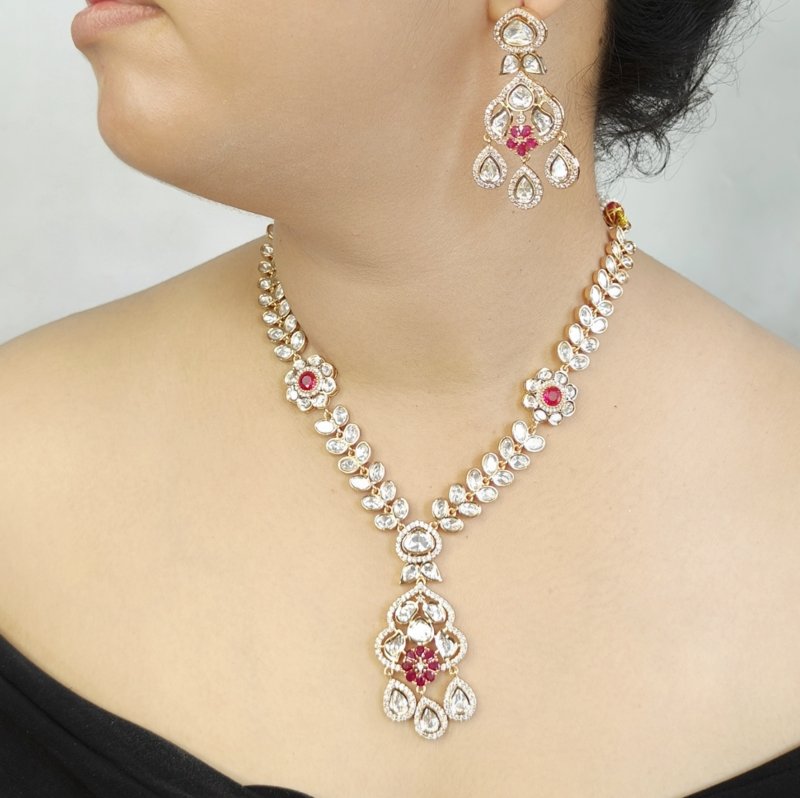 This stunning uncut Polki pendant set features a mid-length design, elegantly paired with matching earrings. The pieces are beautifully studded with vibrant red hydro stones and sparkling cubic zirconia (CZ), creating a perfect blend of traditional and contemporary charm.
