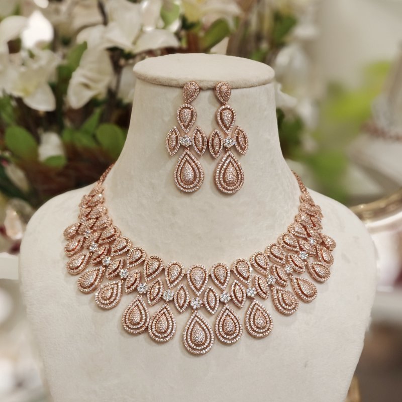 A stunning set featuring an Indo-Western neckline and long dangling earrings crafted with CZ and set in micropave setting to give it exact real look of dimaond necklace .