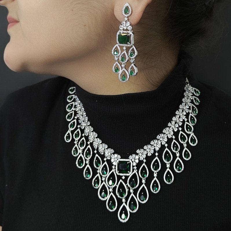 This stunning necklace features cubic rbc and tear drop zirconia stones with emerald green colored stones, crafted in white gold plated mixed metal alloy
