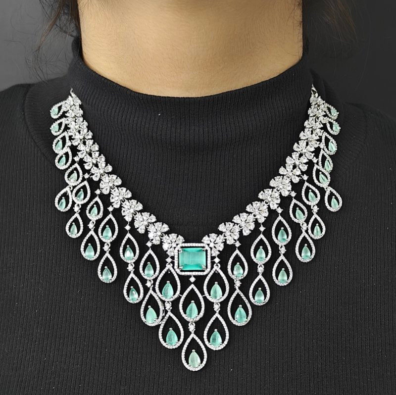 This stunning necklace features cubic rbc and tear drop zirconia stones with mint green colored stones, crafted in white gold plated mixed metal alloy