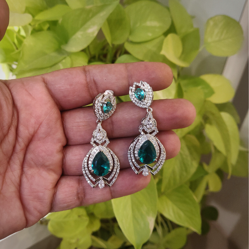 Modern-style earrings featuring tear-drop shaped English green stones are available in white rhodium plating .