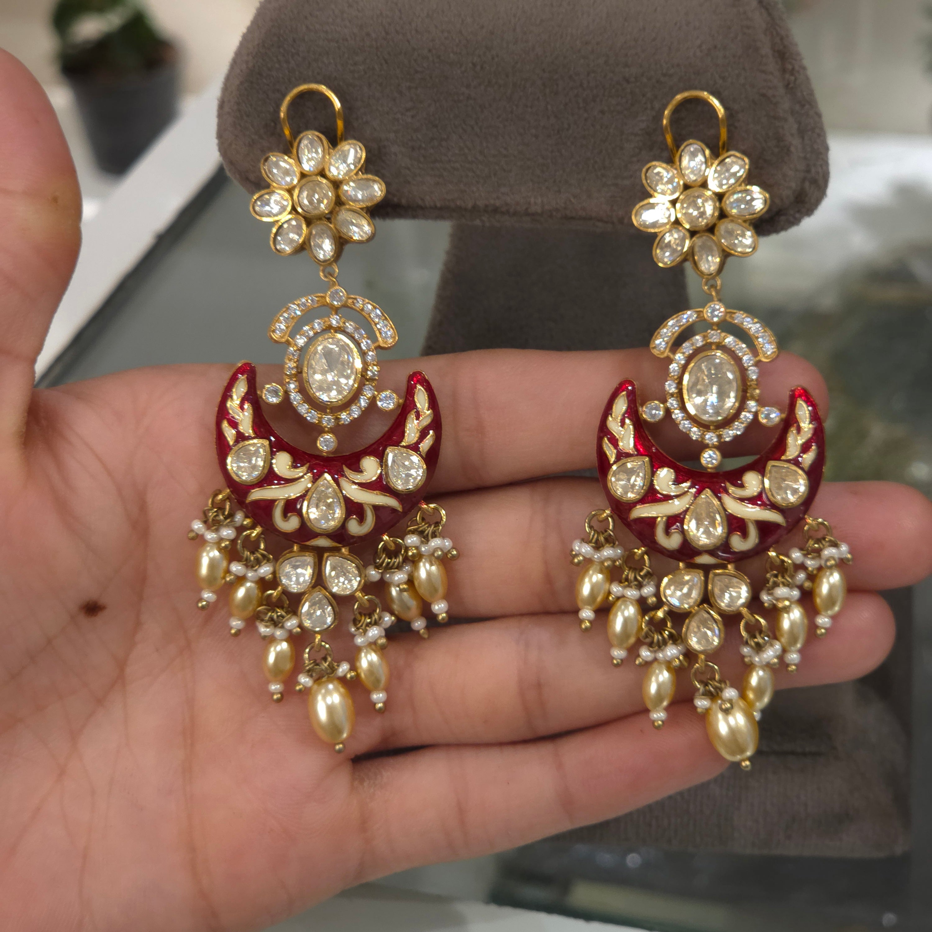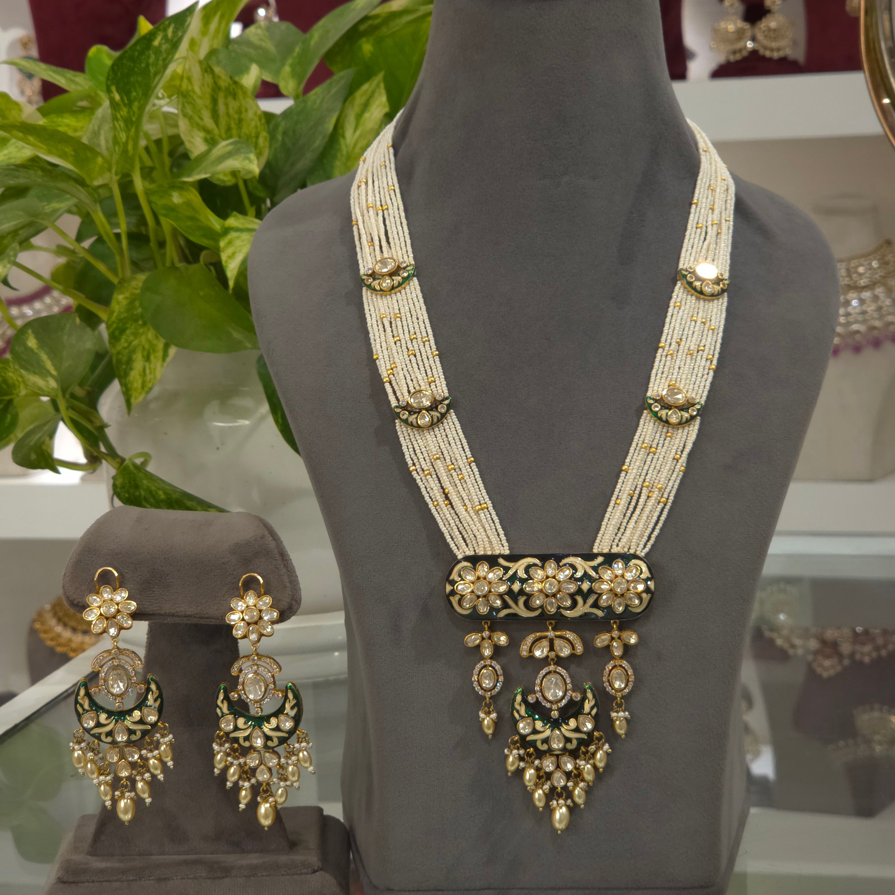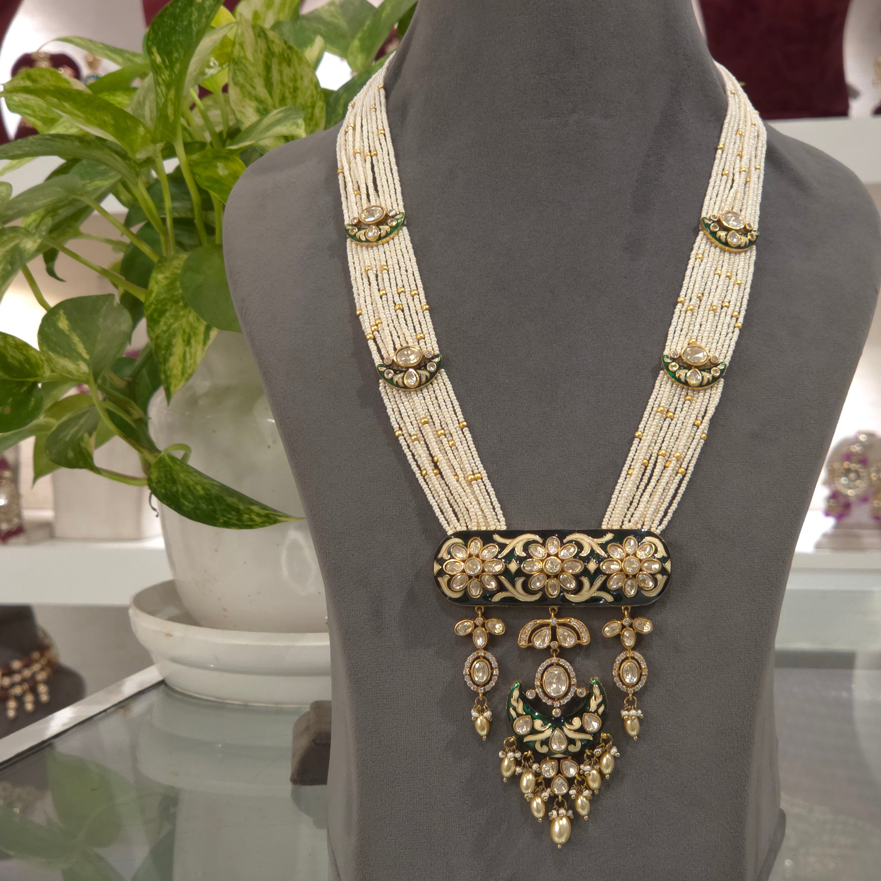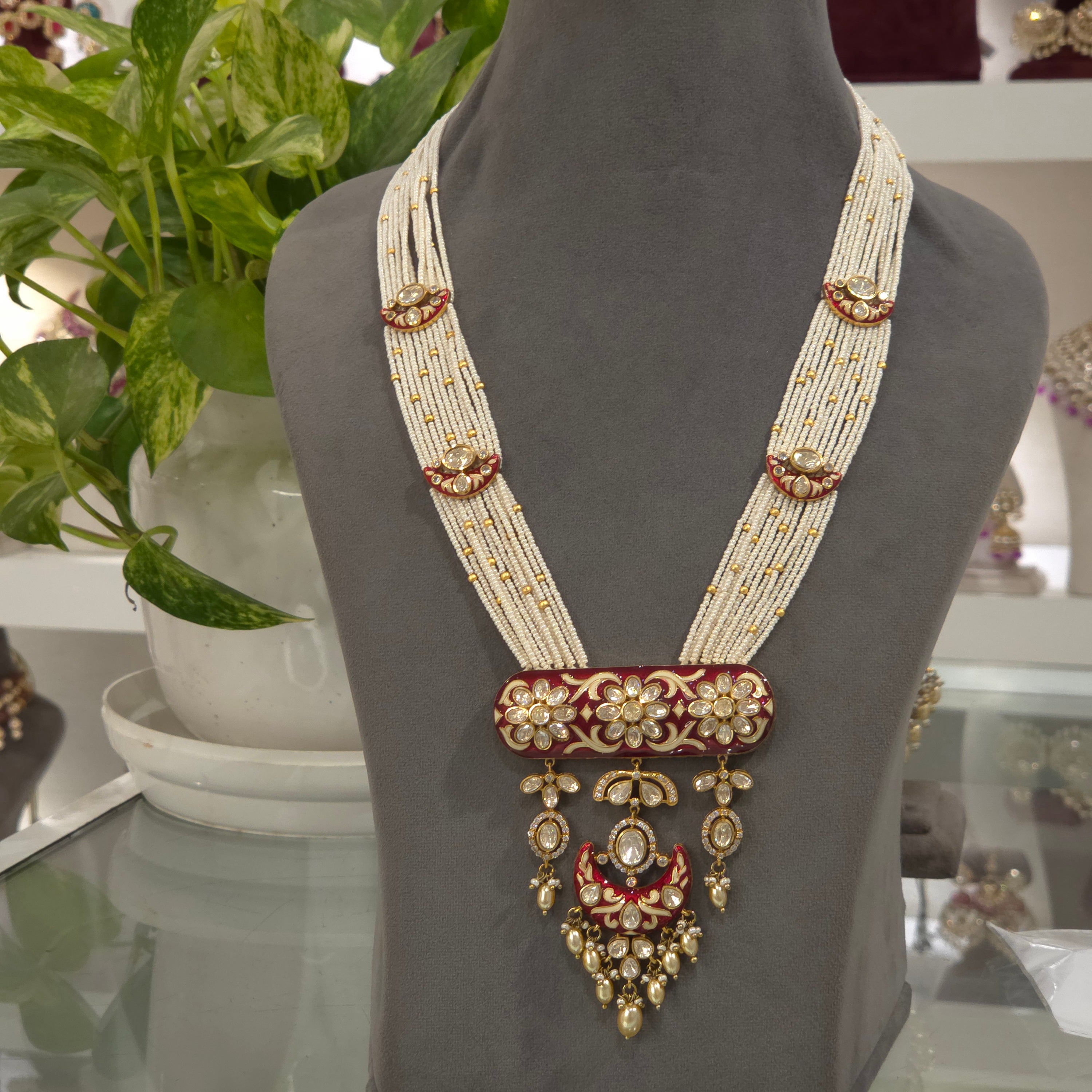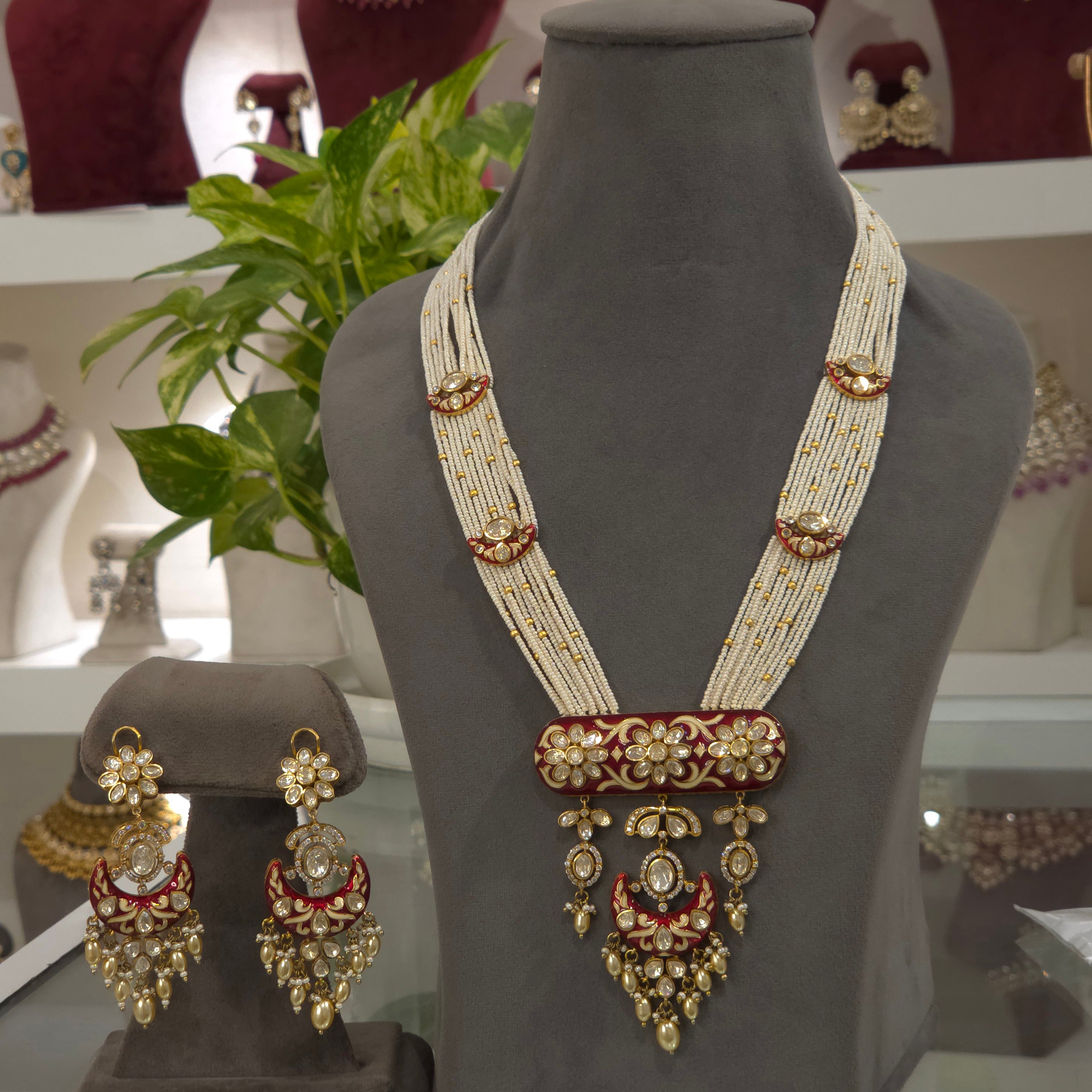 The Ennie Enamal Polki Set is meticulously crafted from gold-plated mixed metal alloy and features exquisite meenakari work. It showcases uncut polki stones in distinctive red and black hues, complemented by delicate micro pearl beading. This combination enhances durability and adds an elegant touch, suitable for various occasions as this is long pendent set style .