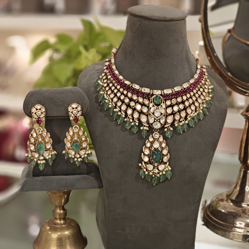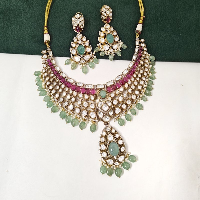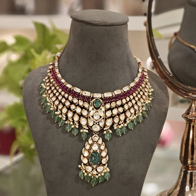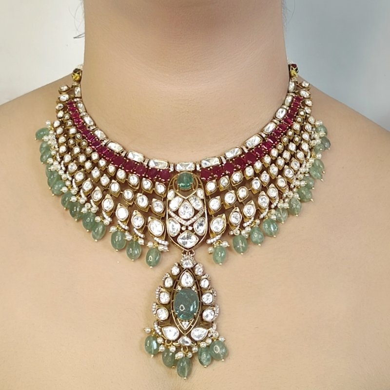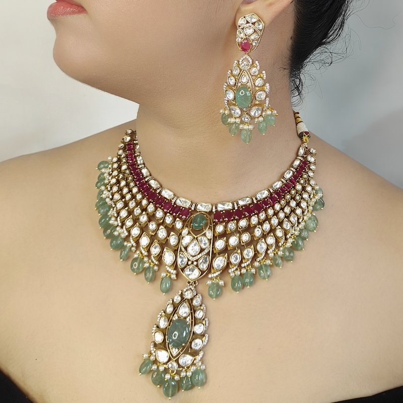 This exquisite bridal necklace set features a stunning combination of uncut moissanite polki, delicately plated in 22K matte gold. The design is enhanced with vibrant mint green doublet stones and glossy winesh ruby-colored accents, adding a touch of elegance and luxury. The necklace is beautifully beaded with mint green beads and pearls, creating a perfect blend of sophistication and tradition. Complemented by long, intricate earrings, this set is a true statement piece for any bride seeking timeless beauty on her special day.