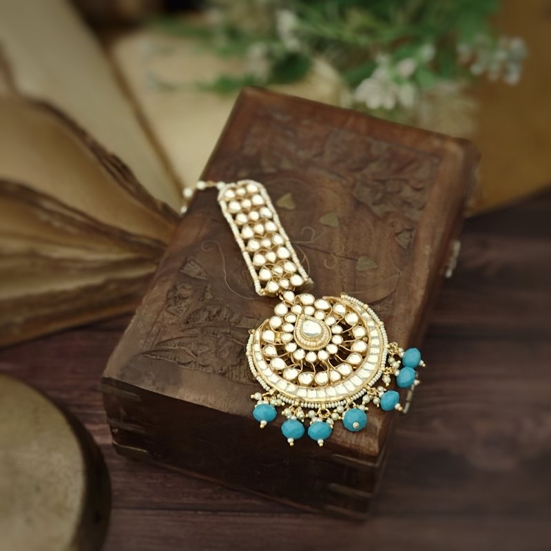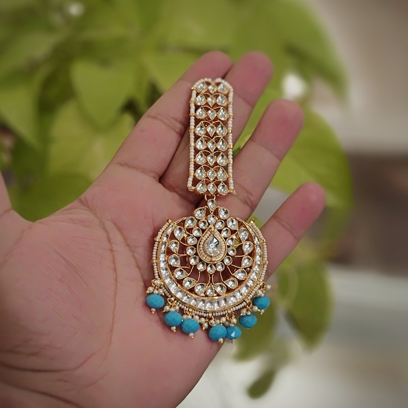 Crafted in ahmedabadi paachi kundan in chaand design , this is a statement tikka with broad patti at the back ,beaded with cheed and turquoise beads .