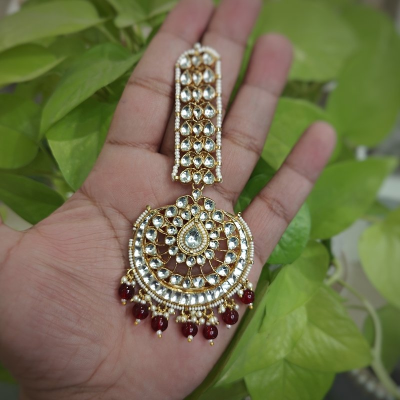 Crafted in ahmedabadi paachi kundan in chaand design , this is a statement tikka with broad patti at the back ,beaded with cheed and maroon beads .