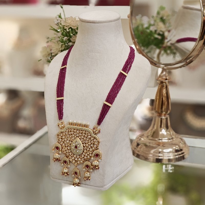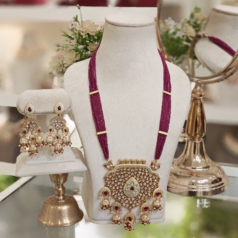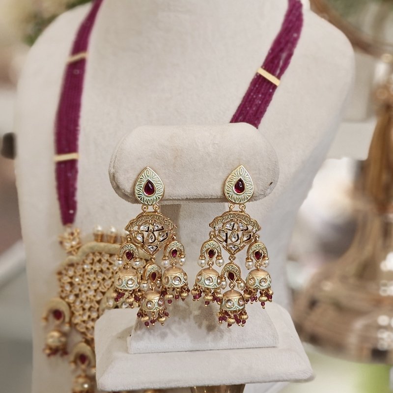 This exquisite set showcases meticulously cut polki stones and is adorned with delicate mint green enamel work. Enhancing its allure, the pendant is accompanied by earrings featuring elegant jhumki designs embellished with tiny wine beads.