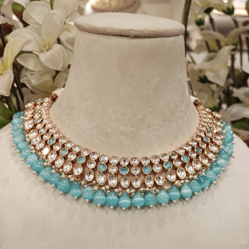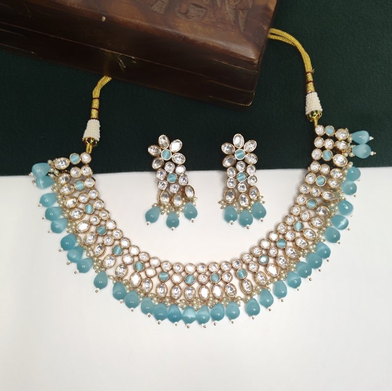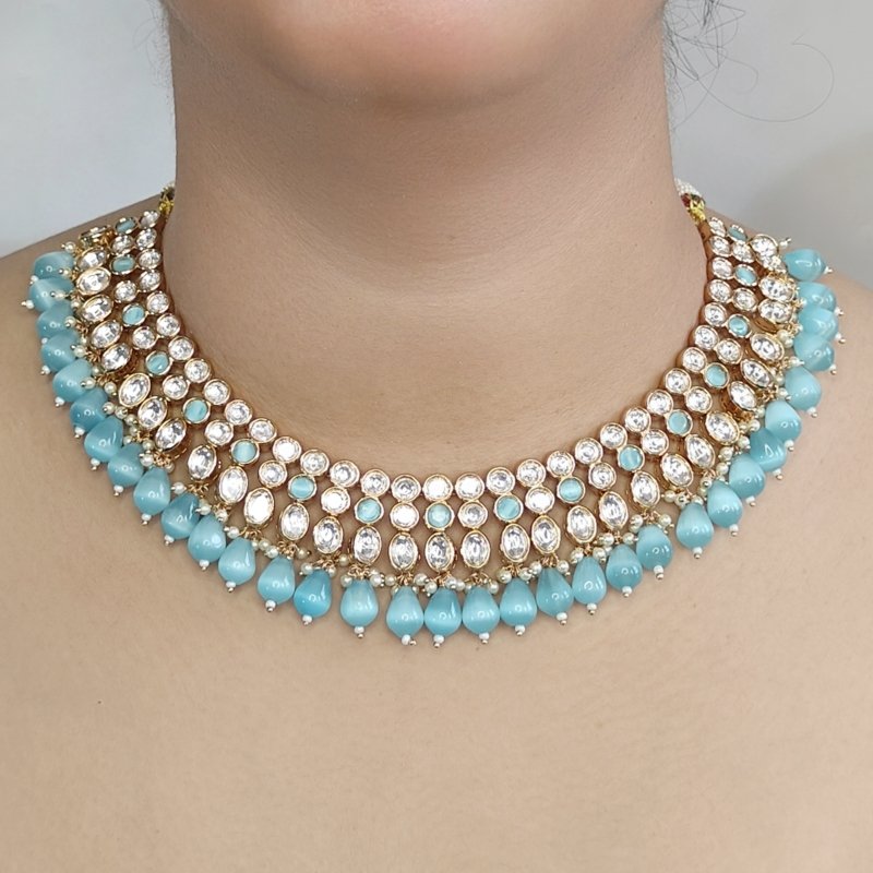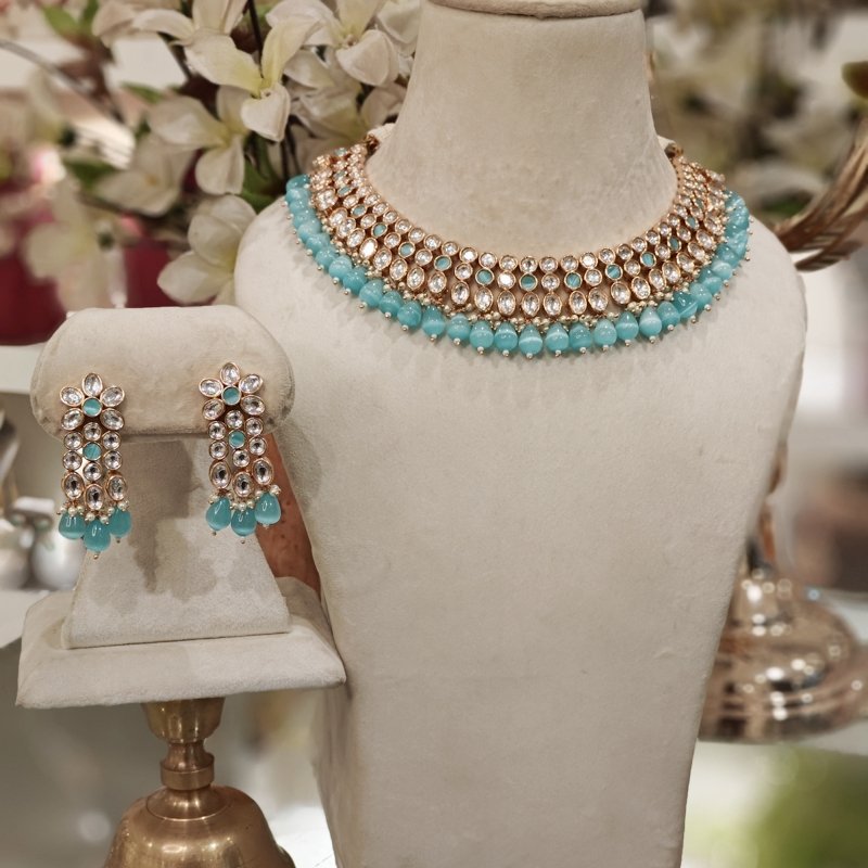 Very flexible neckline set made with finest artificial polki stones with earrings ,strung with aqua coloured drop shaped beads .
