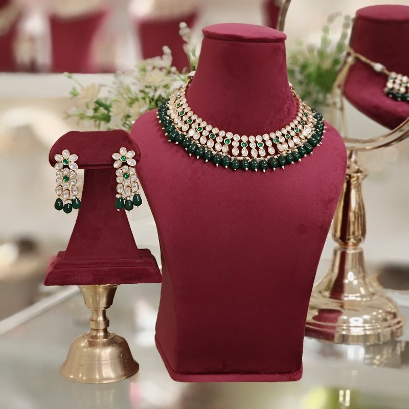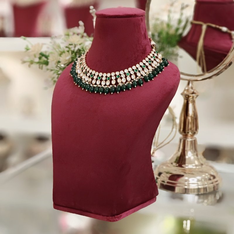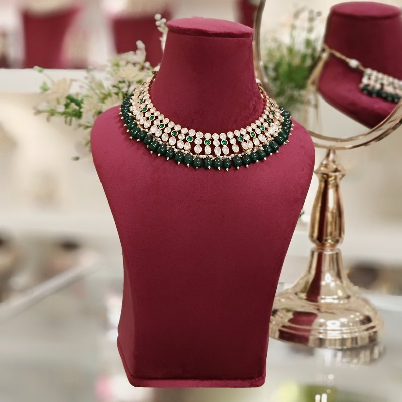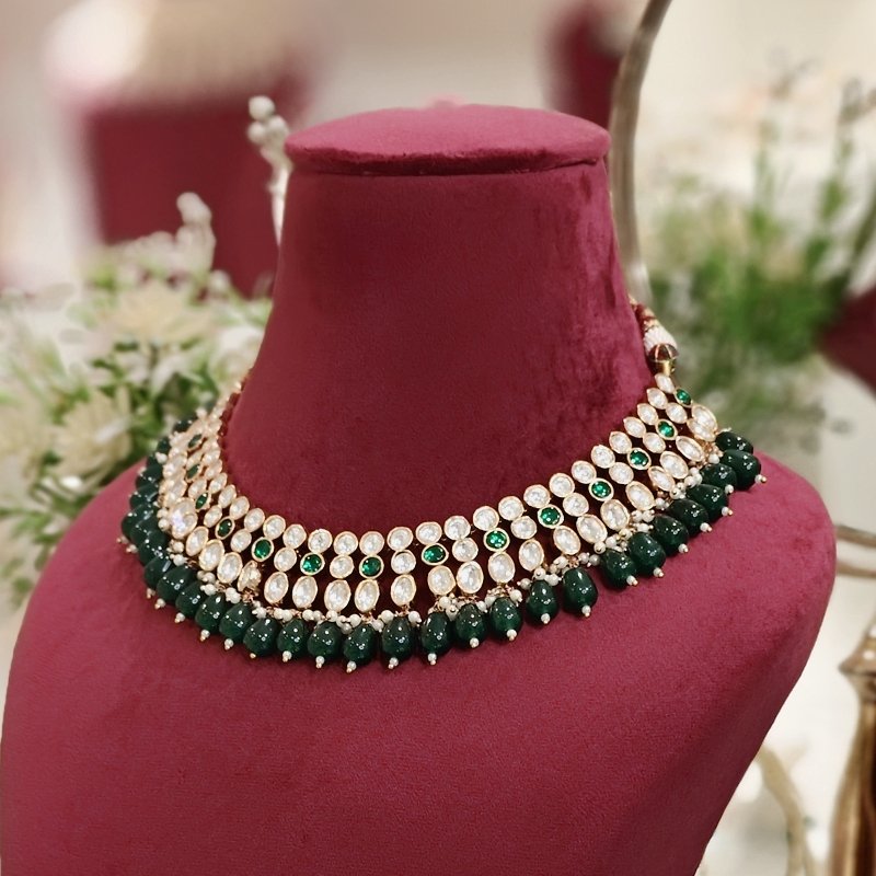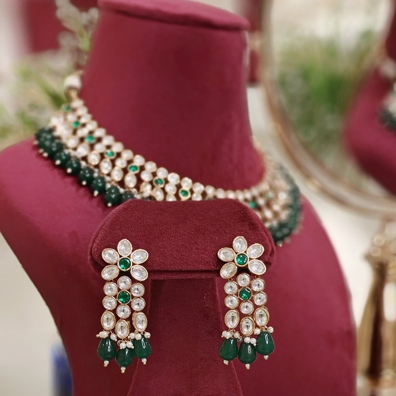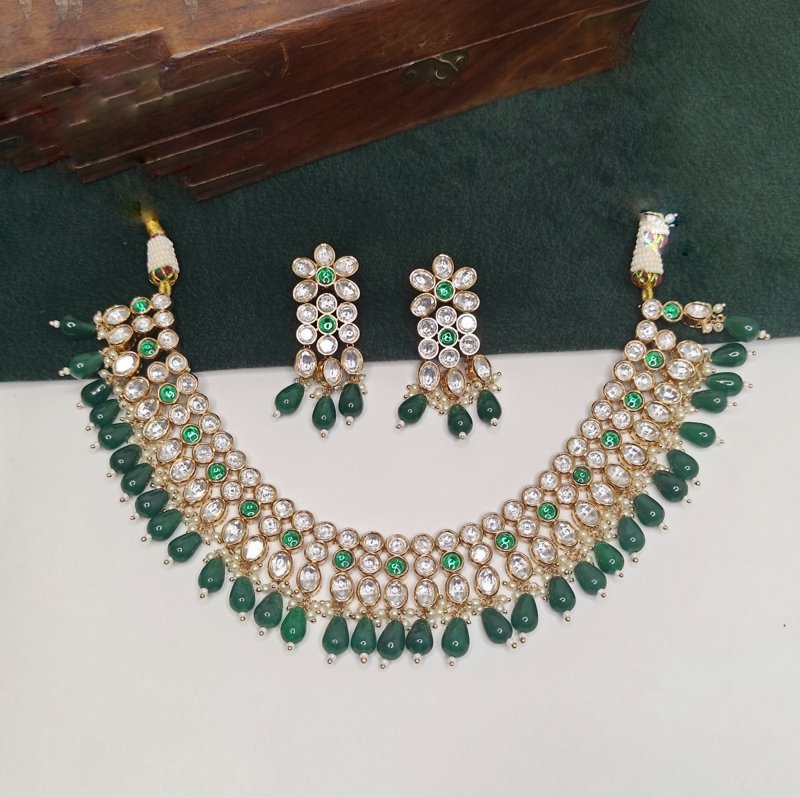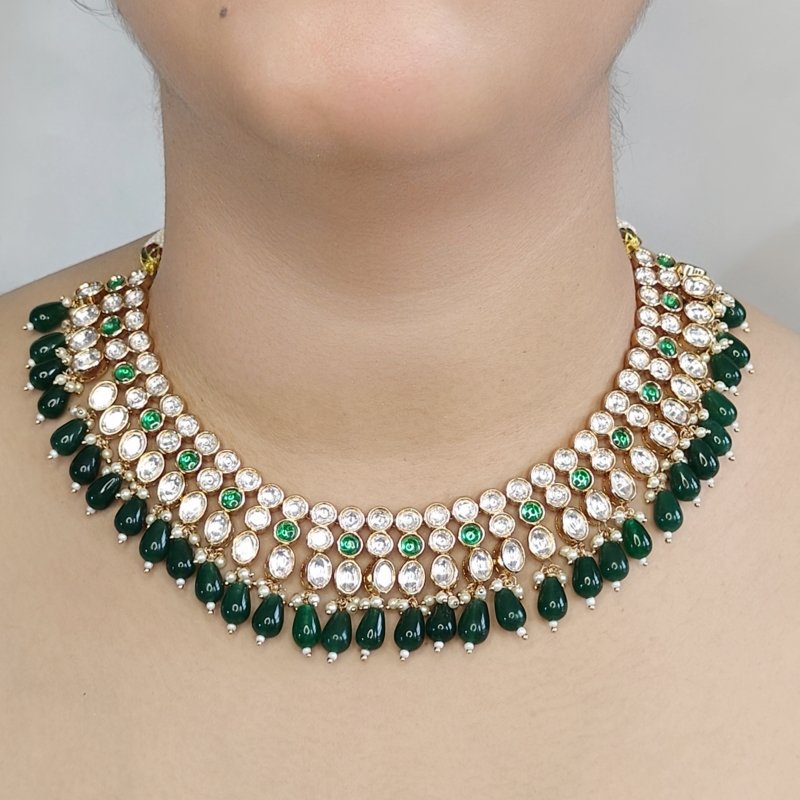 Very flexible neckline set made with finest artificial polki stones with earrings ,strung with green coloured drop shaped beads .