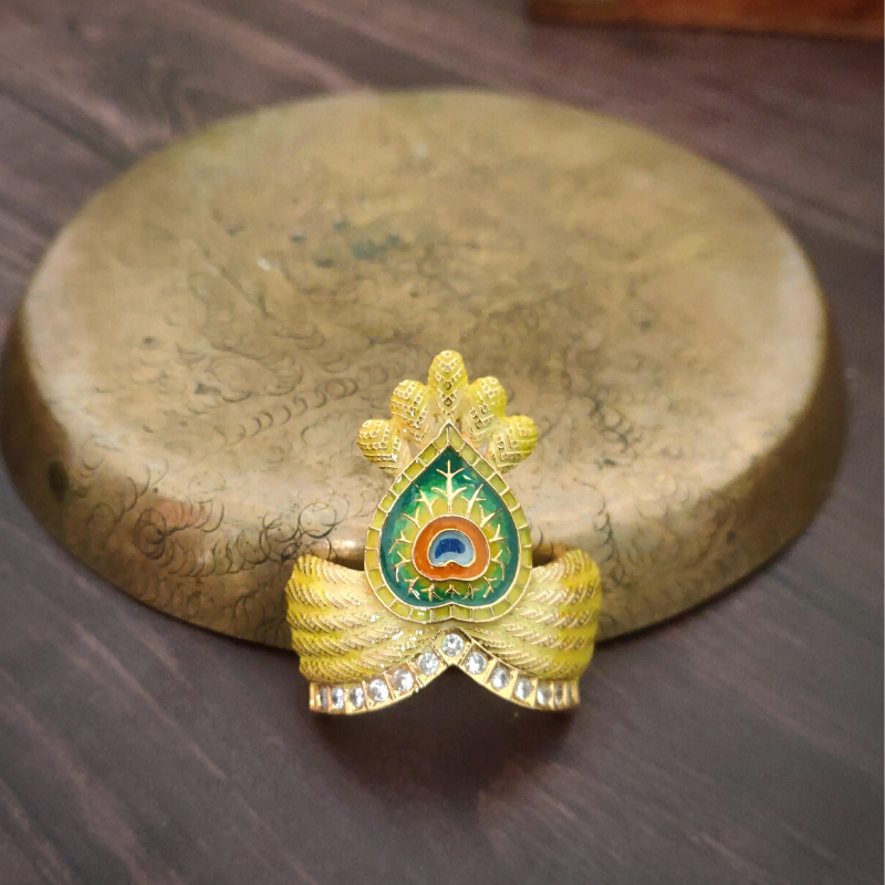 Crafted from the most exceptional artificial polki, this exquisite moorpanki mukut is adorned with intricate meena work in shades of yellow and green.