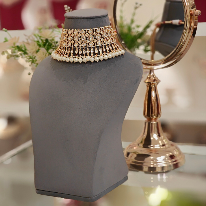 The Gunjan choker set is meticulously crafted using the finest uncut artificial polki and gorgeous ivory enamel facades, which is then plated with a luxurious 22kt gold hue to add more charm to it. To create this ornate piece of beauty even more special, the necklace is integrated with lovely pearls that are arranged in a beaded fashion. This necklace can be customized in any colour of your choice .