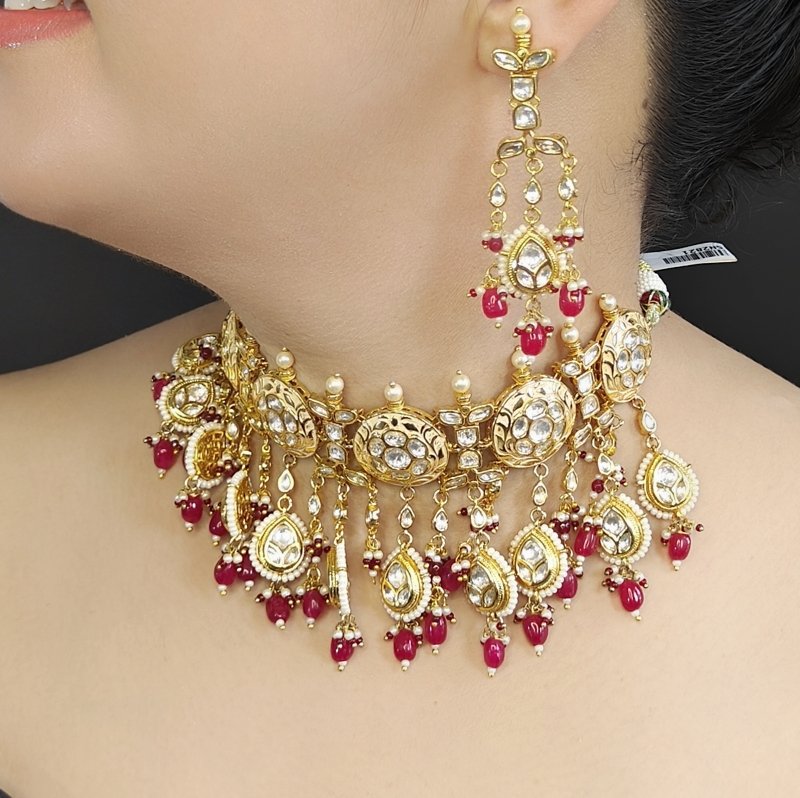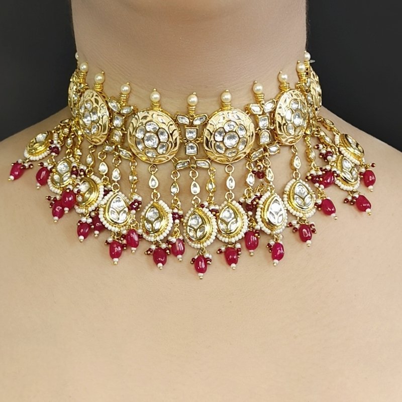 This medium-weight flexible choker showcases stunning uncut Polki, intricately beaded with ruby red beads and lustrous pearls. Designed for comfort and elegance, it effortlessly blends traditional craftsmanship with modern wearability—perfect for elevating both festive and formal looks with a touch of timeless grace.