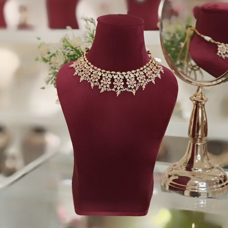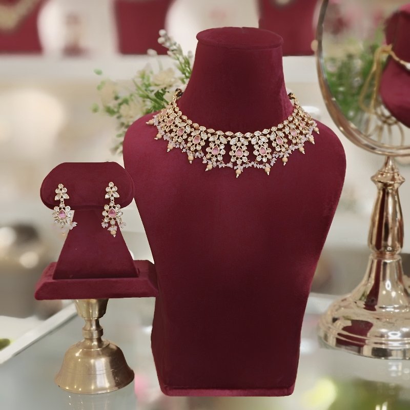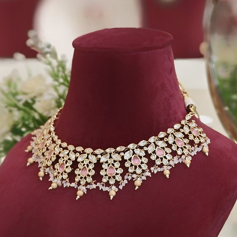 This beaded necklace features a stylish design with a refined neckline made of polki and pink stones. The pink and golden balls add a pop of color while the 18 kt gold plating provides an added touch of sophistication.