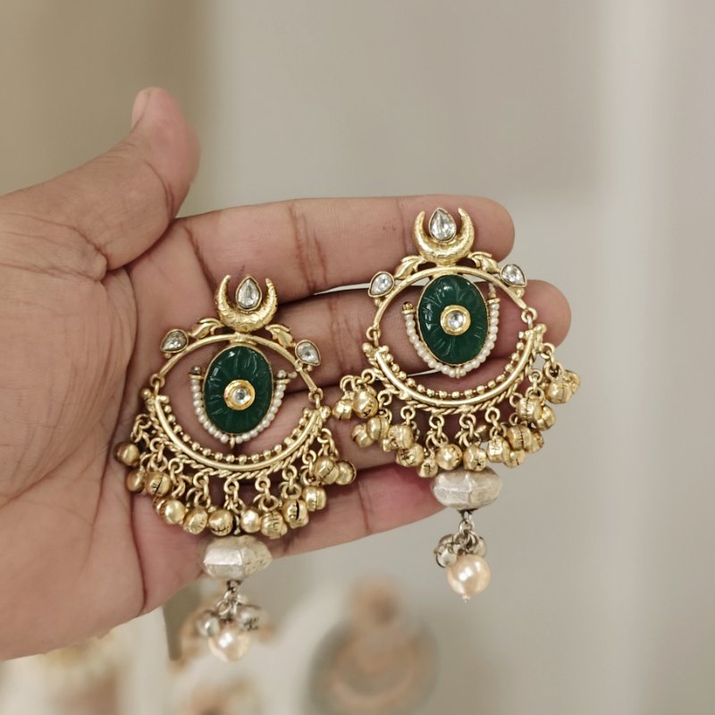 Harika earrings designed in the shape of eye stuuded with pink and green stones accompanied with polki and pearls .