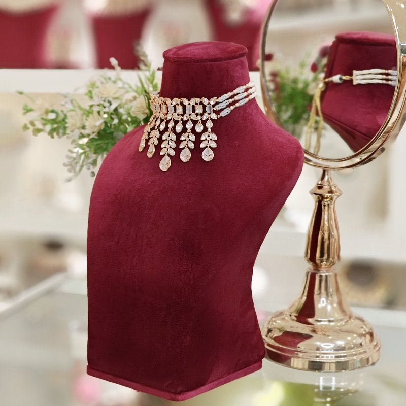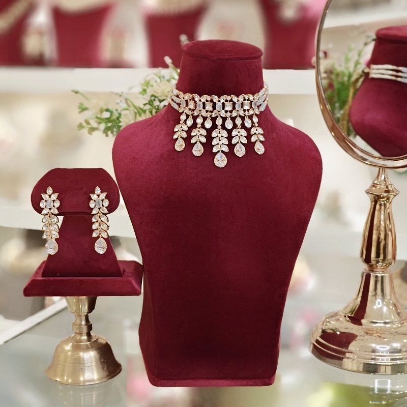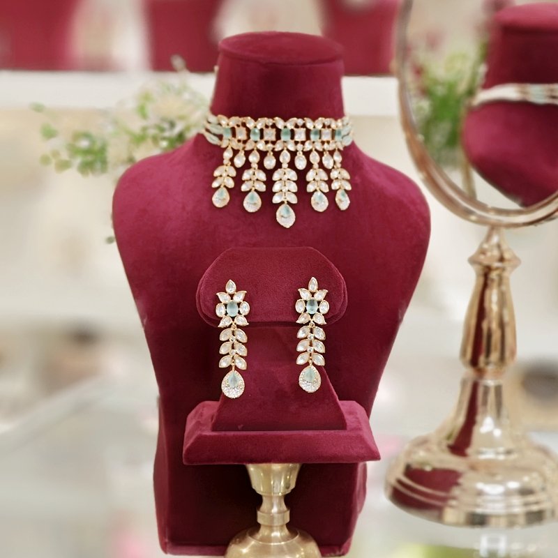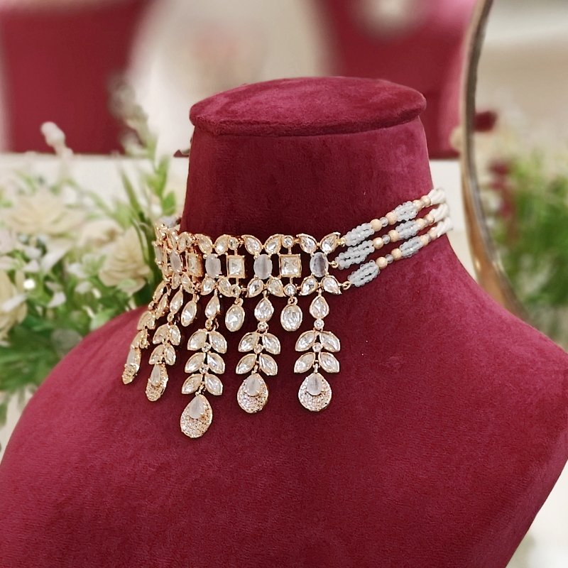 A choker set made of 18 kt gold plating , featuring Artificial uncut polkies ,cubic zirconia and grey faceted stones. The necklace is accented with grey hydro beads for an elevated appearance.
