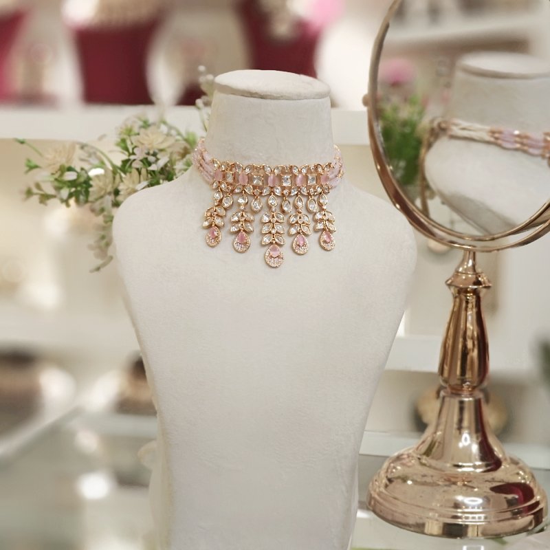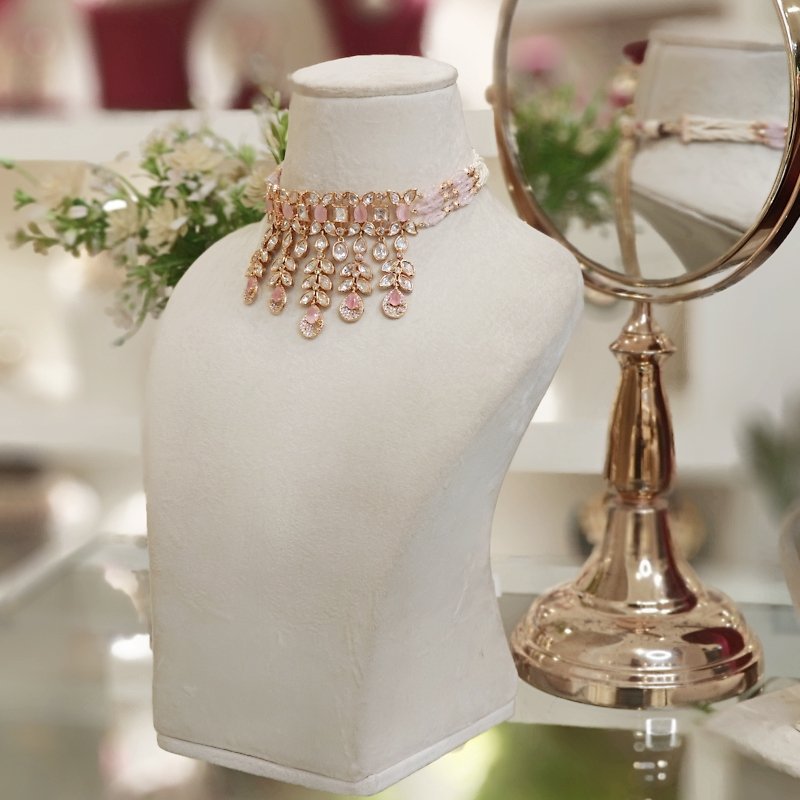 A choker set made of 18 kt gold plating , featuring Artificial uncut polkies ,cubic zirconia and pink faceted stones. The necklace is accented with pink hydro beads for an elevated appearance.