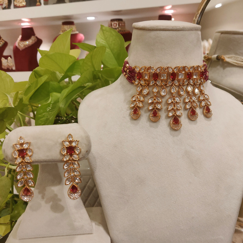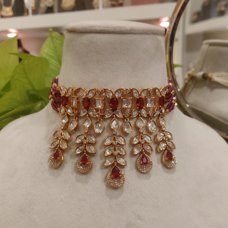 A choker set made of 18 kt gold plating , featuring Artificial uncut polkies ,cubic zirconia and deep maroon faceted stones. The necklace is accented with maroon hydro beads for an elevated appearance.