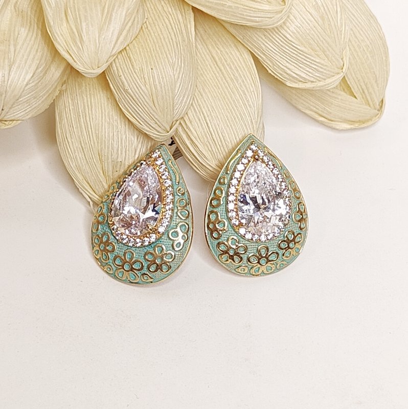 These medium sized studs are made with tear drop shaped cubic zirconia and designed in meenakri flower pattern and mirror polished in 18 kt gold colour .