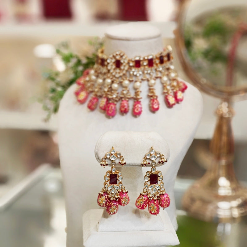 A stunning choker set adorned with traditional coloured paachi kundan craftsmanship, complemented by big ruby tanzor kundan tumble stones