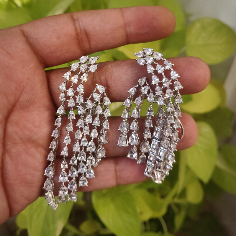 Crafted with elegance, these earrings feature teardrop-shaped zircons that are set in six sleek lines. The back of each earring is secured with a Bombay clasp, adding both style and functionality.