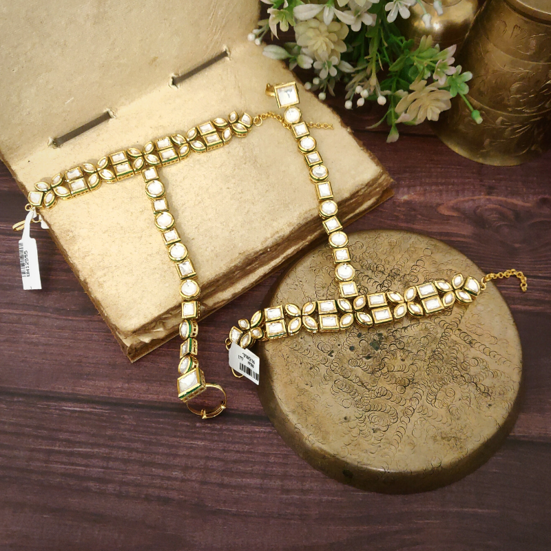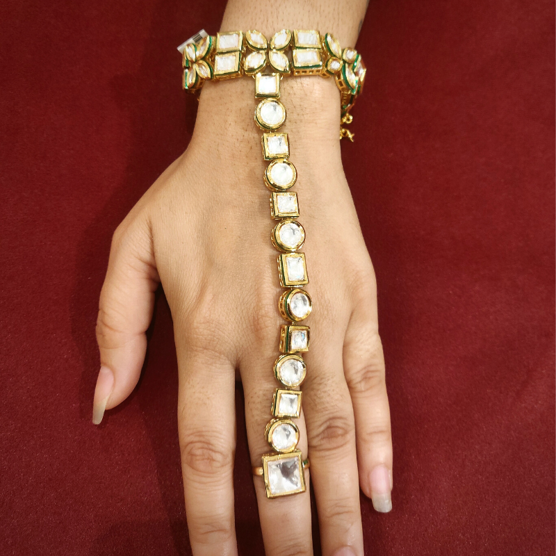 Crafted using high quality kundan and plated in 22 kt, the Hetal Hathphool is an adjustable piece of hand accessory that exudes elegance and sophistication.