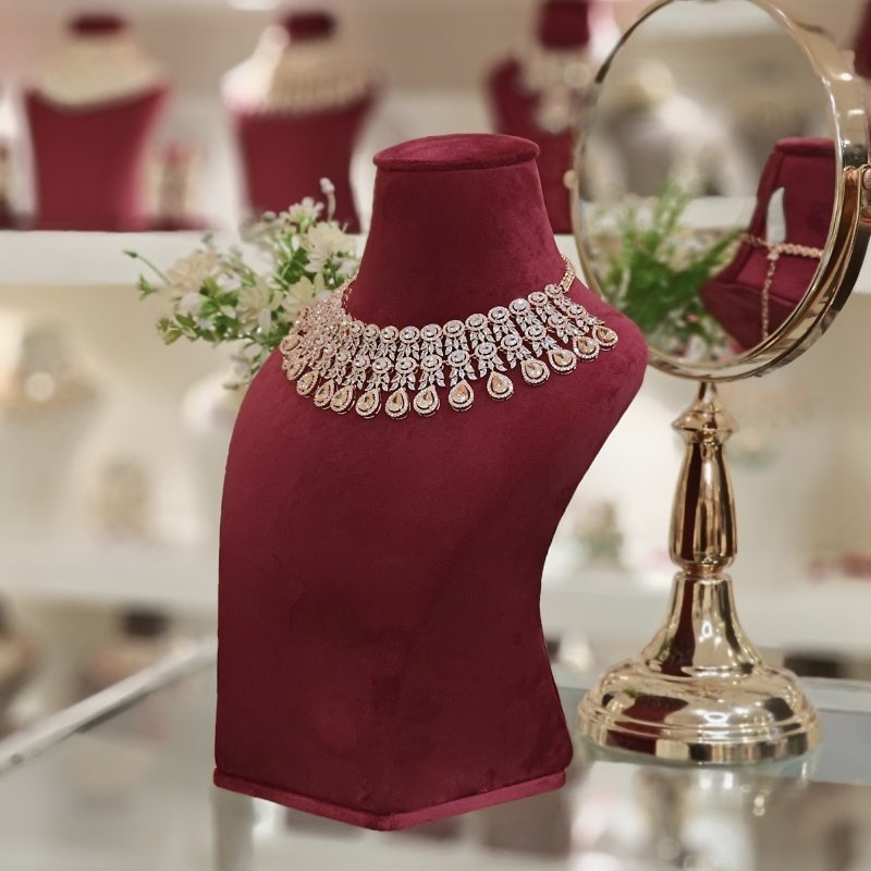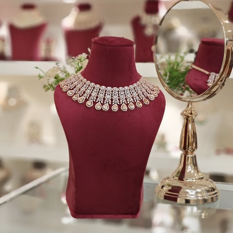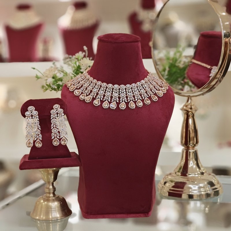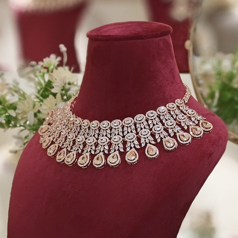 A stunning set featuring an Indo-Western neckline and long dangling earrings crafted with CZ and Champagne coloured hydro faceted stones, all coated in white gold plating.