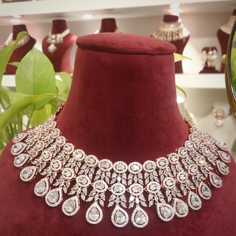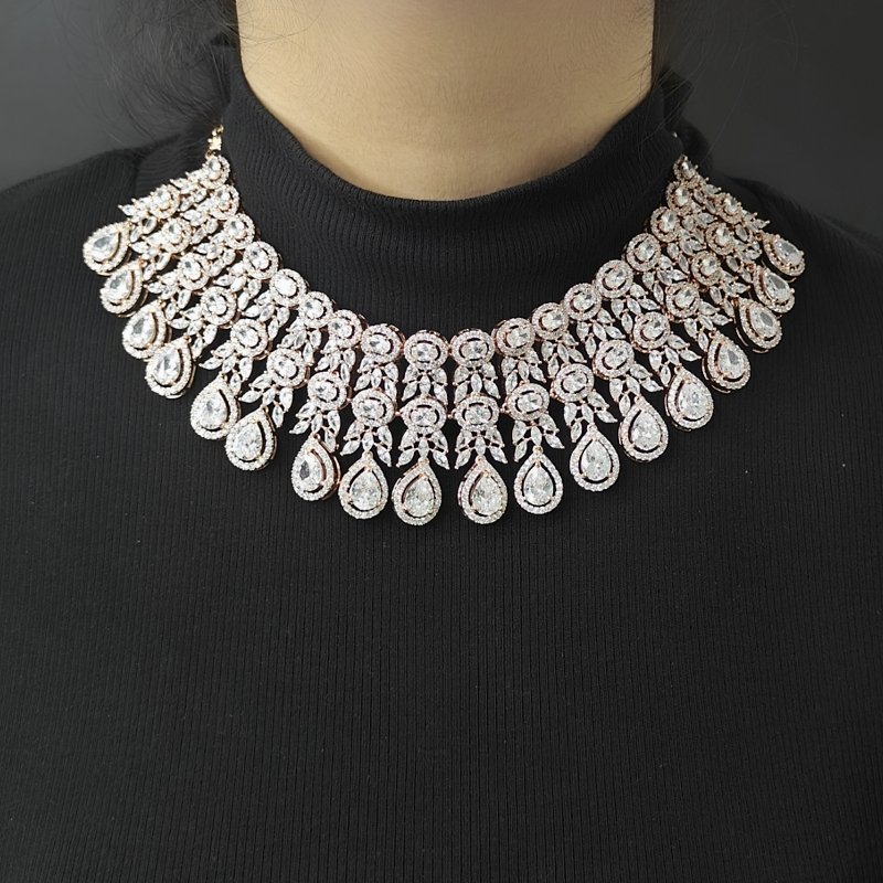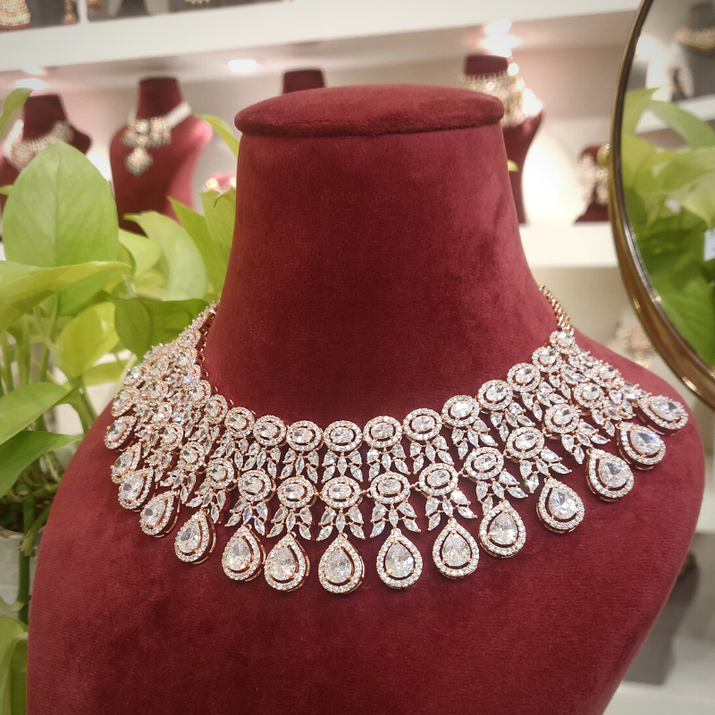A stunning set featuring an Indo-Western neckline and long dangling earrings crafted with CZ faceted stones, all coated in Rose gold plating.