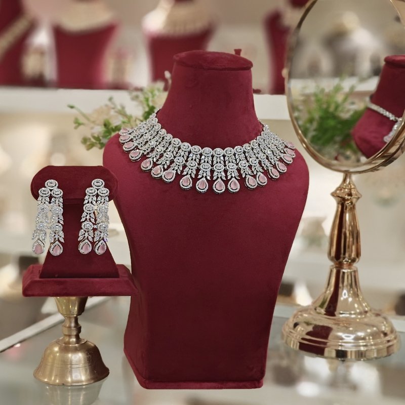 A stunning set featuring an Indo-Western neckline and long dangling earrings crafted with CZ and Baby Pink hydro faceted stones, all coated in sleek white rhodium plating.