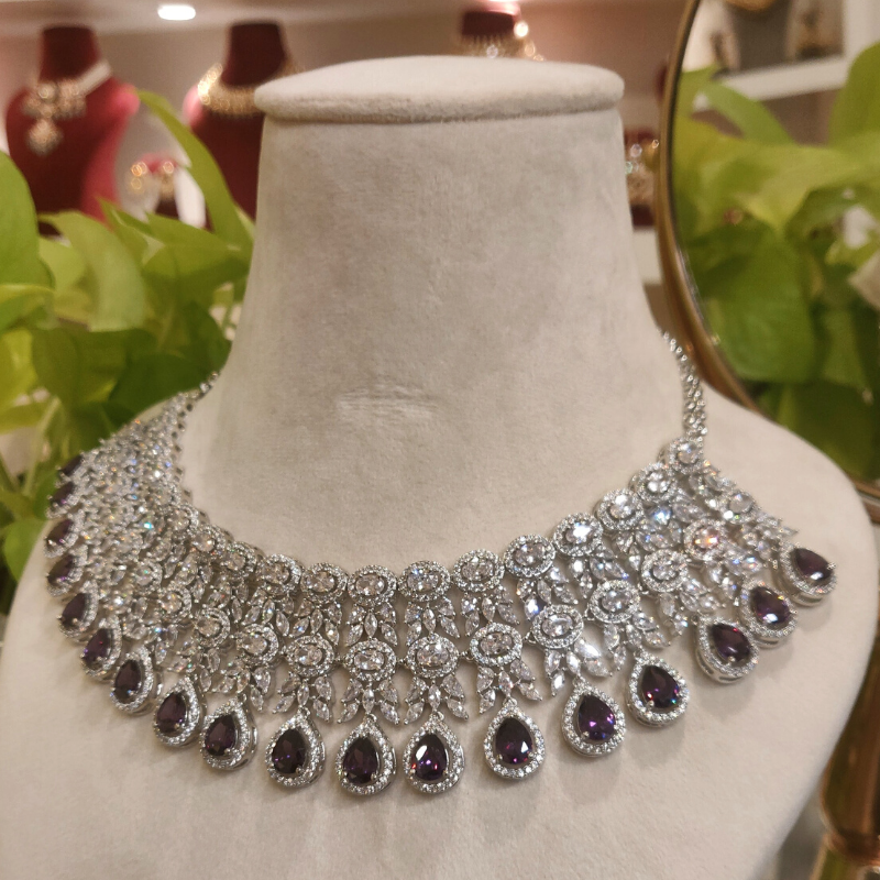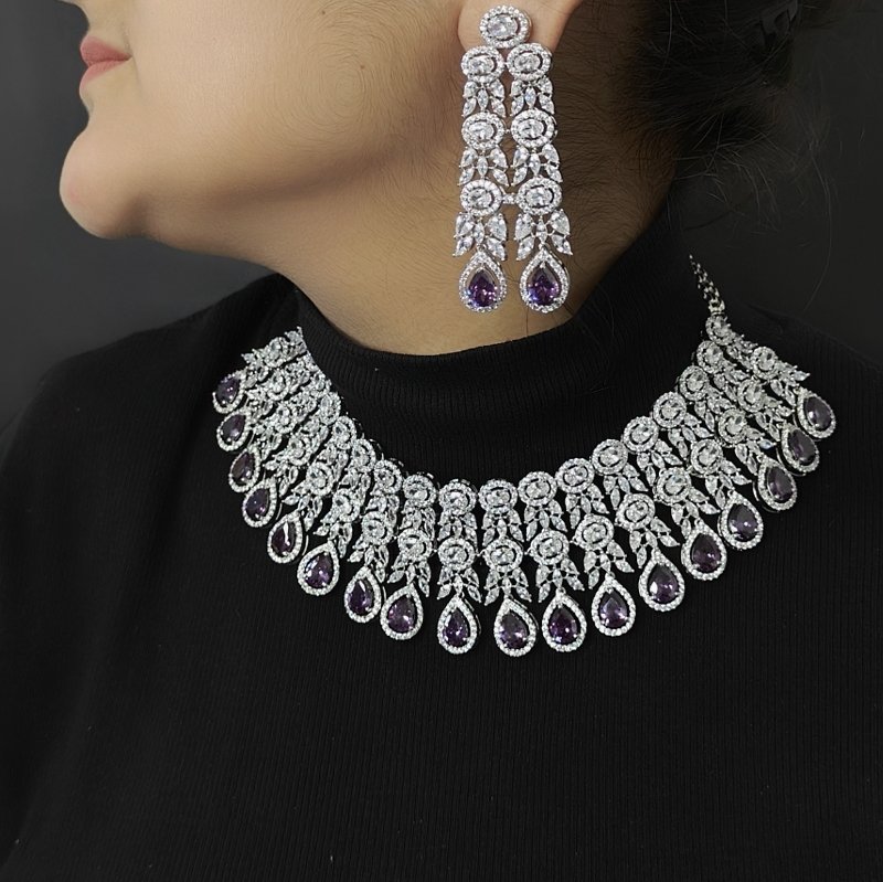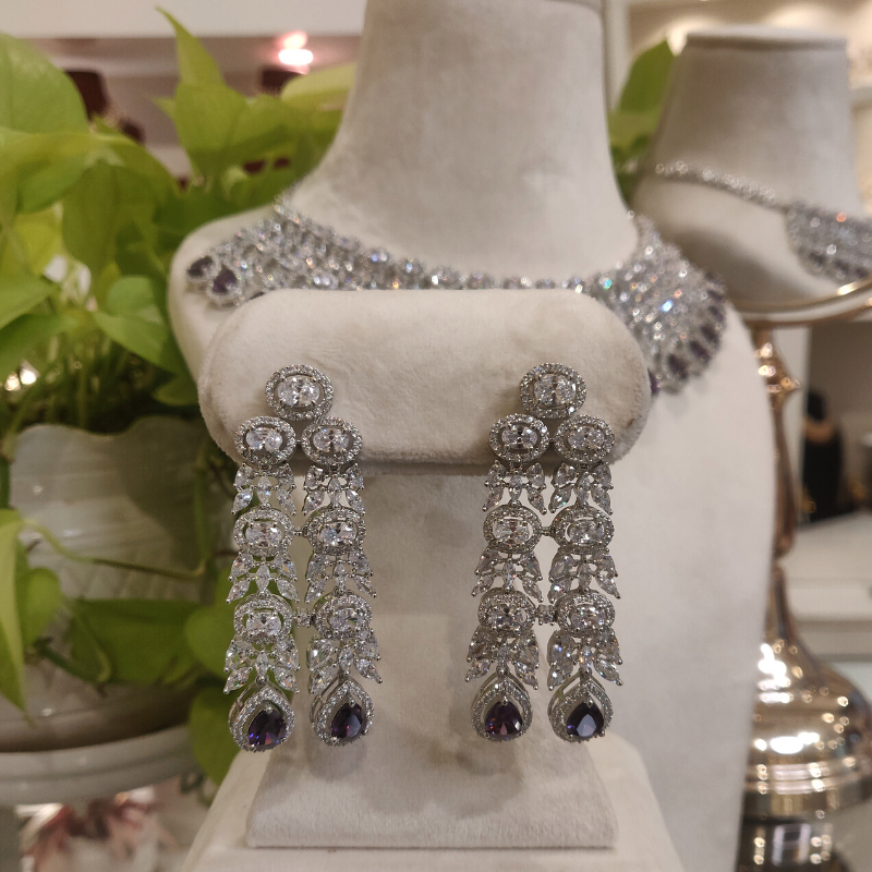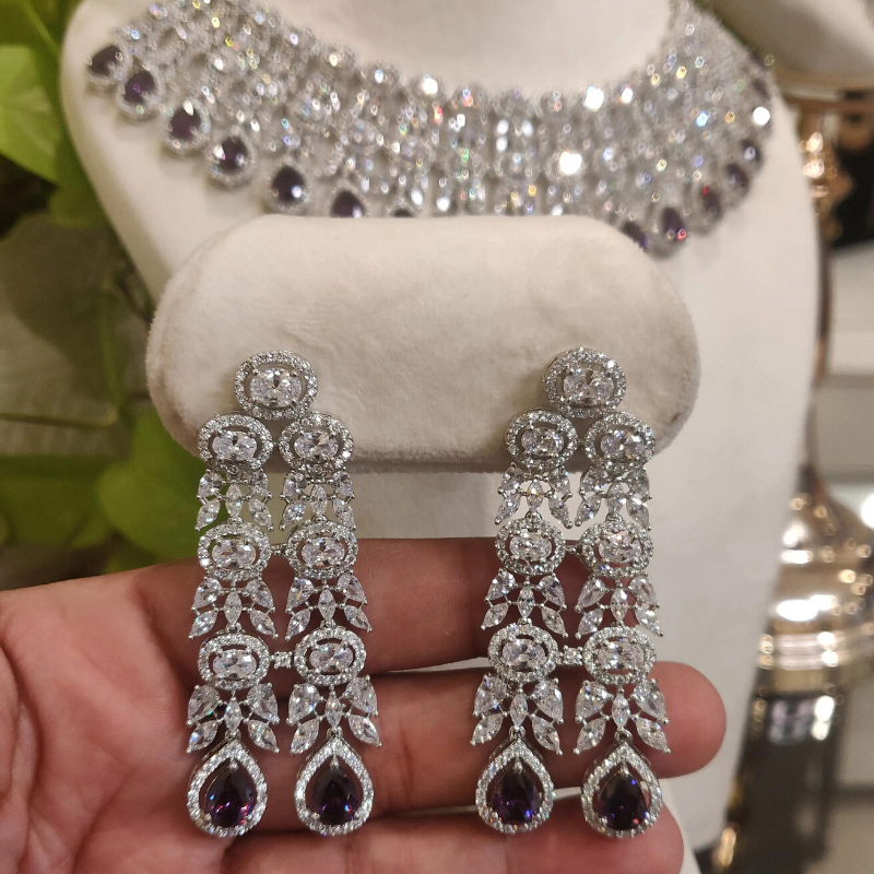 A stunning set featuring an Indo-Western neckline and long dangling earrings crafted with CZ and Purple hydro faceted stones, all coated in sleek white rhodium plating.
