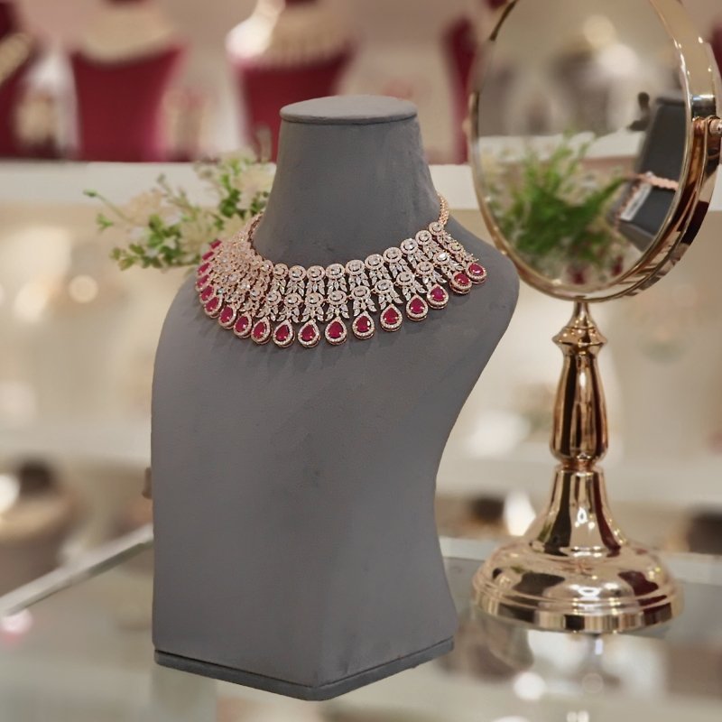 A stunning set featuring an Indo-Western neckline and long dangling earrings crafted with CZ and Ruby Red hydro faceted stones, all coated in Rose Gold plating.