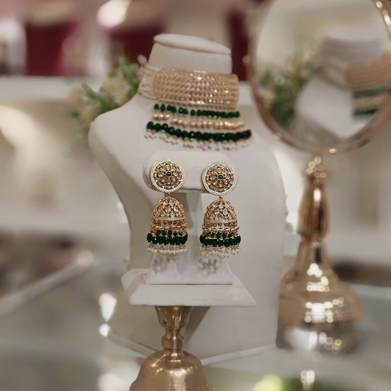 This exquisite piece of jewelry is a choker that has been crafted from artificial polki, which has been beautifully studded with green faceted stones to give it a stunning appearance. . Complementing the choker are a pair of jhumkas that are sure to make heads turn wherever you go. This ensemble is ideal for anyone who wants to add a touch of glamour and sophistication to their outfit.
