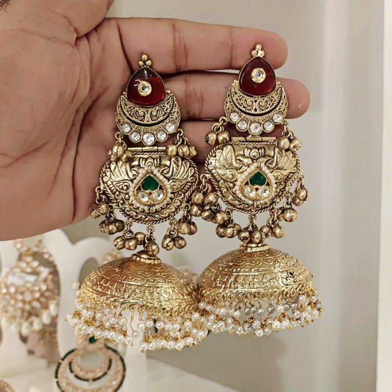 Antique hoor long jhumka made in embossing and jali workmanshio studded with red stone and green kundan meena ,beaded with pearls .