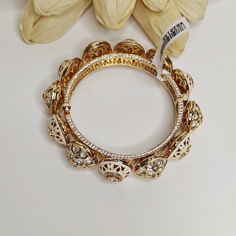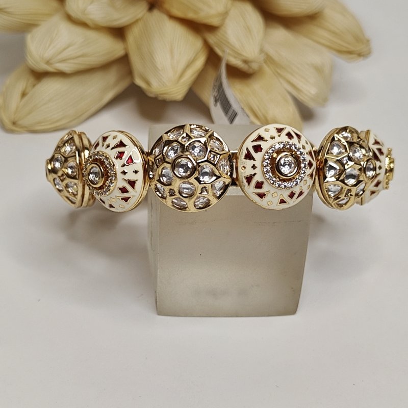 This statement pacheli bangle features silver foil polki stones surrounded by star CZ on the sides, and is beautifully designed with ivory and red enamel work. These openable bangles are adjustable, allowing them to fit a variety of wrist sizes, making them both versatile and stunning.