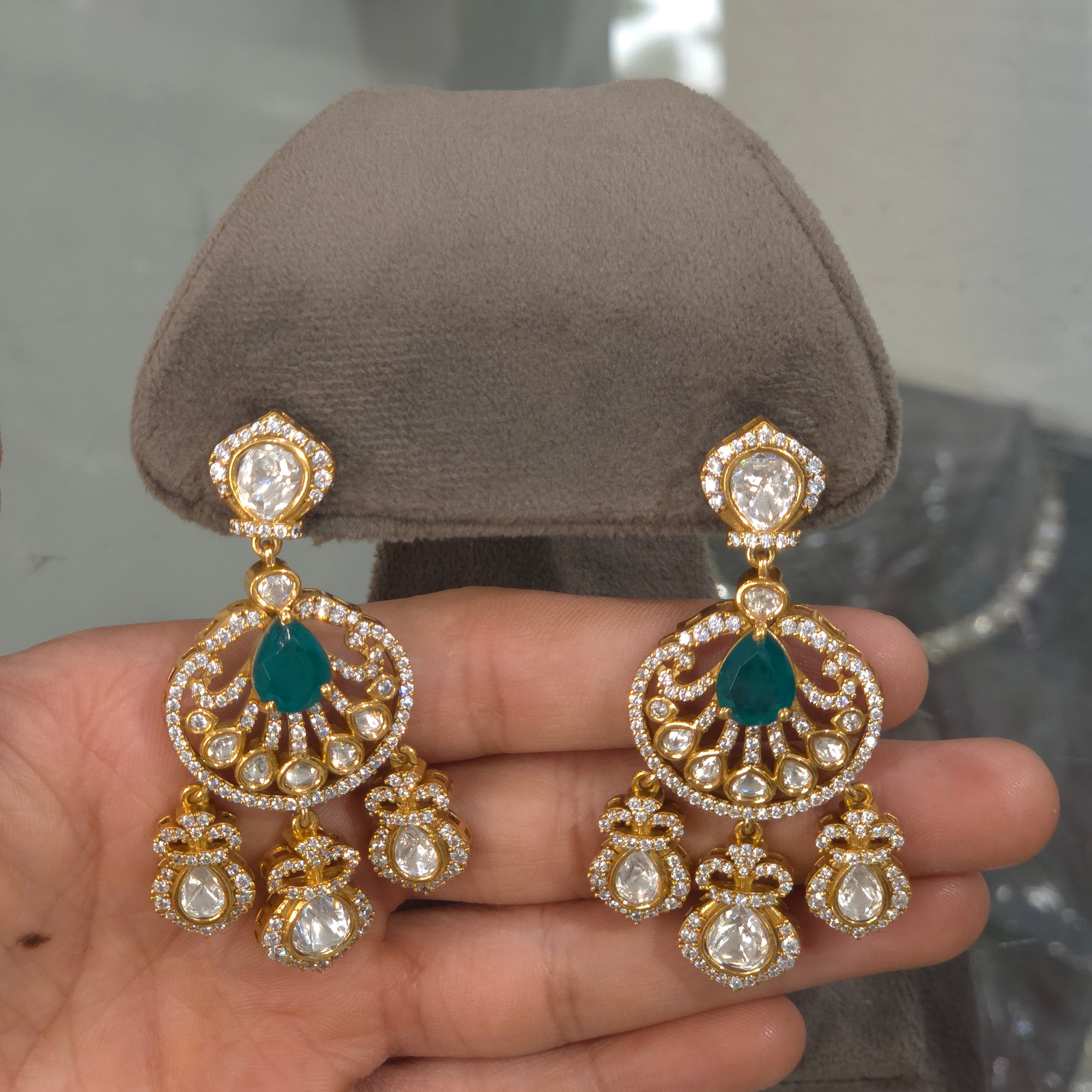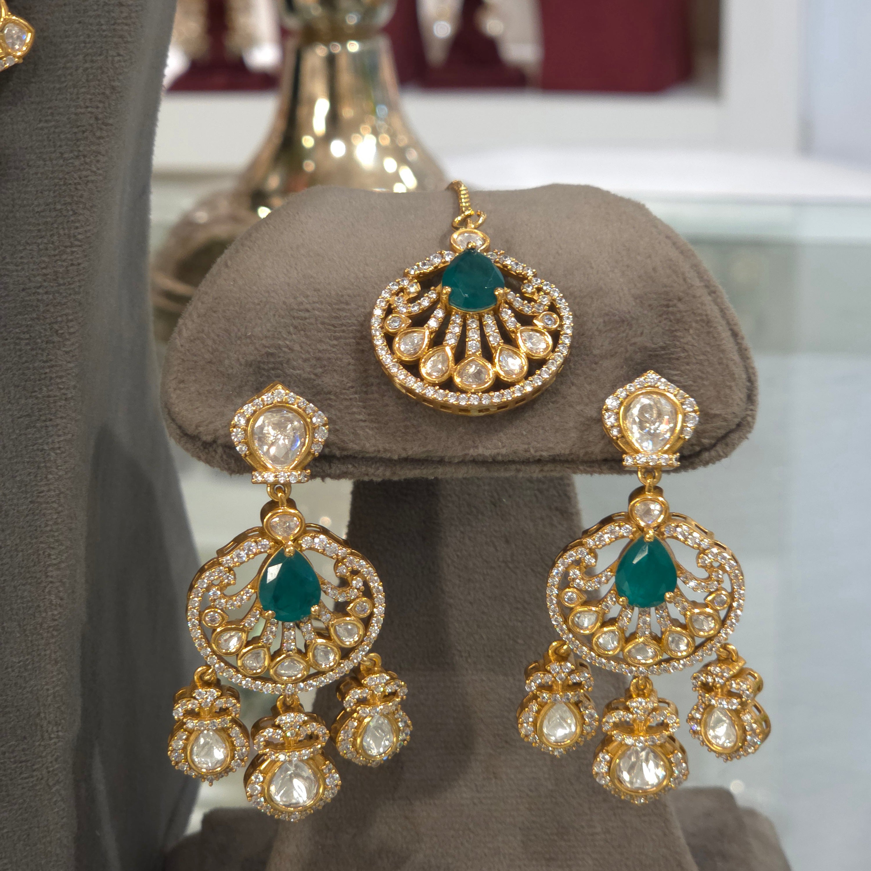 The Hushan Polki necklace set features a striking emerald green hue, comprising a choker-style necklace and a longer necklace. Crafted from gold-plated mixed metal alloy, each set includes distinctive earrings and a mangtikka, combining traditional design with modern elegance. This versatility makes it suitable for various occasions.