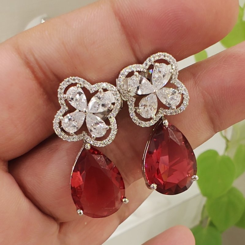 This stunning white rhodium earrings consist of tear shaped CZ with ruby hydro stone.