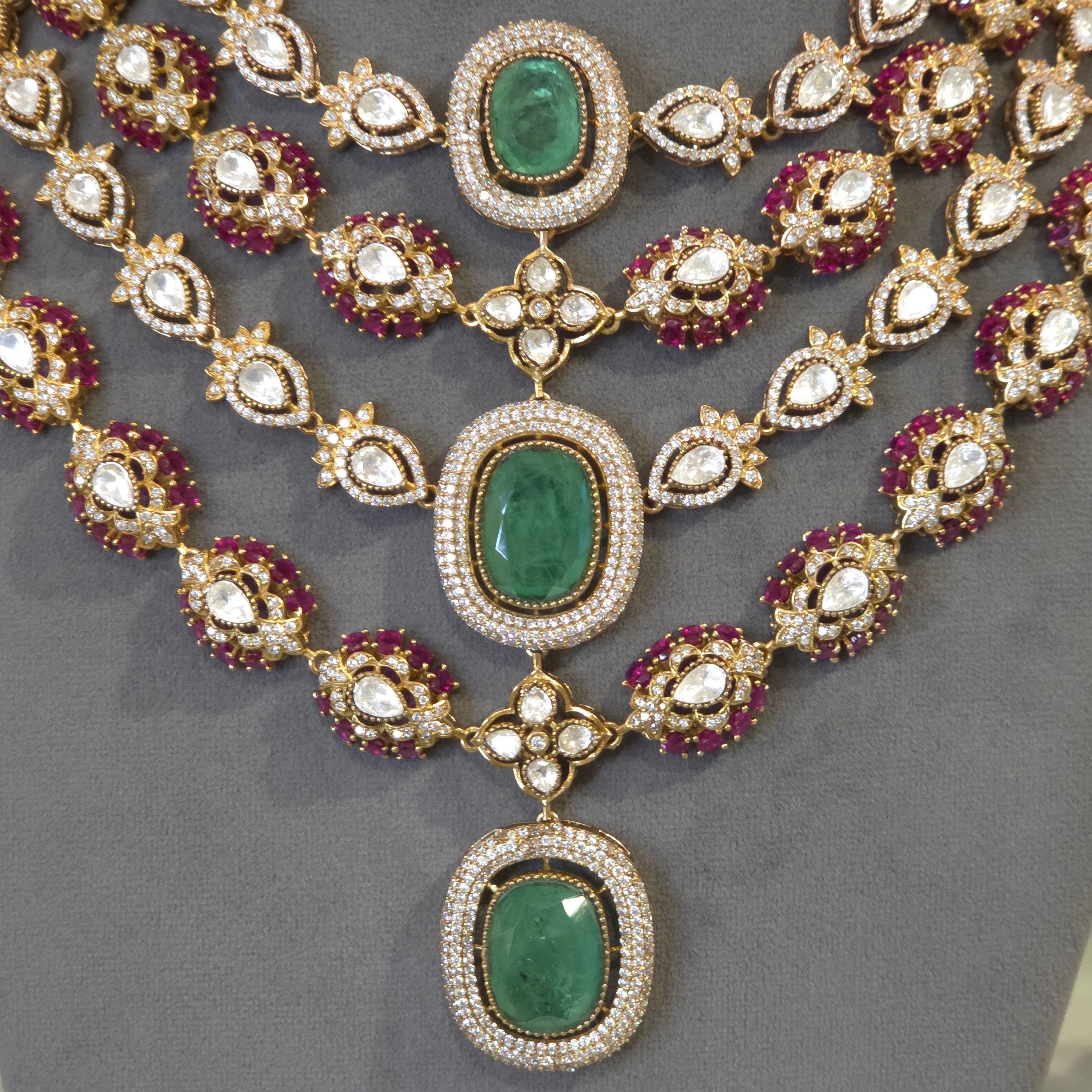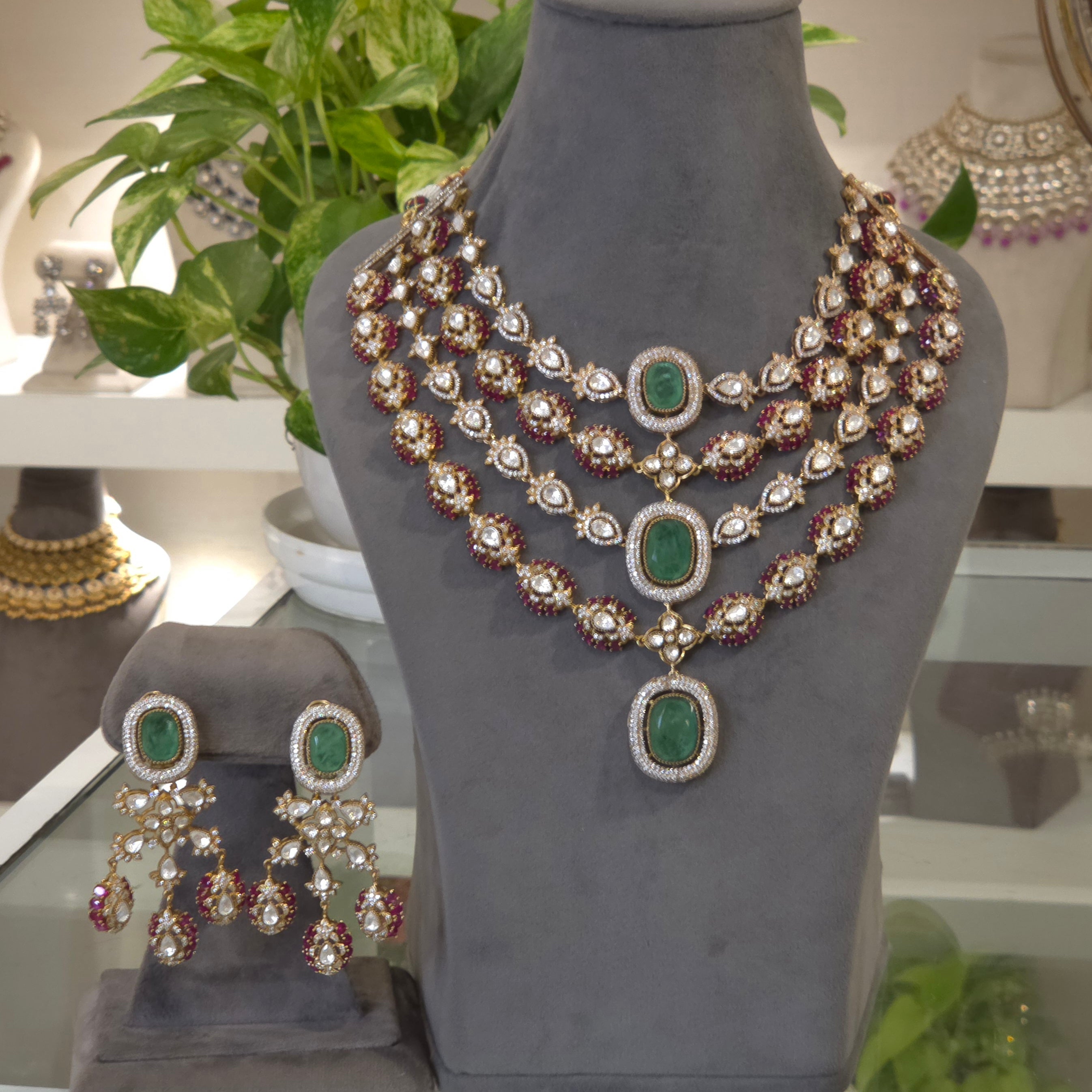 The Ilinaya Victorian Polki Set features a three-line design, showcasing a central mint green stone complemented by red and clear polki stones. Crafted with a matte finish, this Indo-Western necklace merges traditional Victorian aesthetics with contemporary elegance, making it suitable for various occasions and enhancing attire with its distinctive color palette.