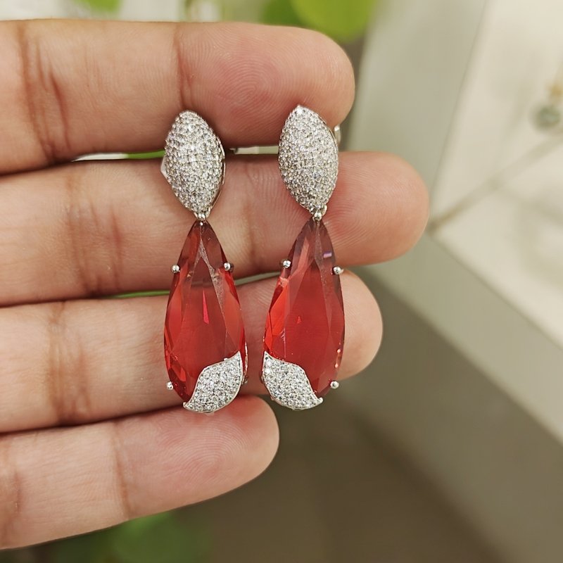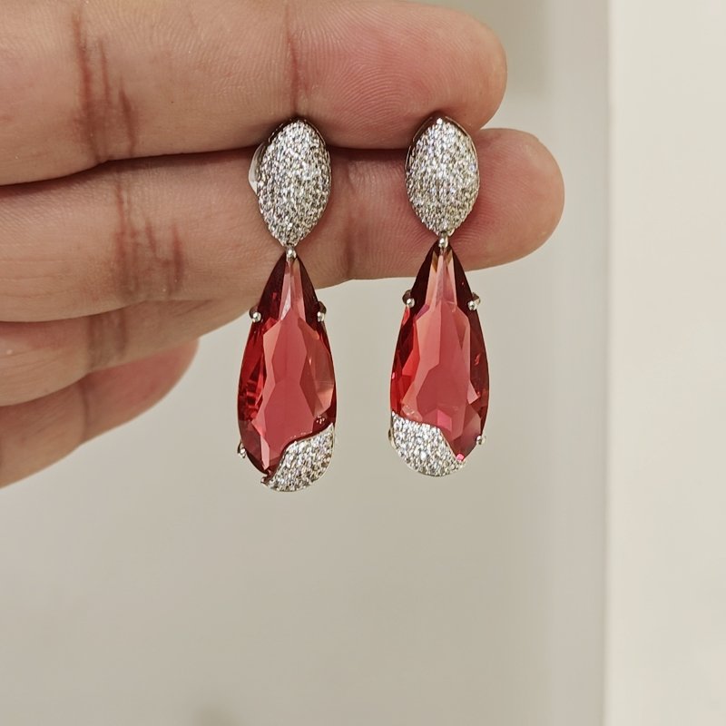 This stunning white rhodium earrings consist of micro pave setted CZ with tear drop shaped Ruby red hydro stone.