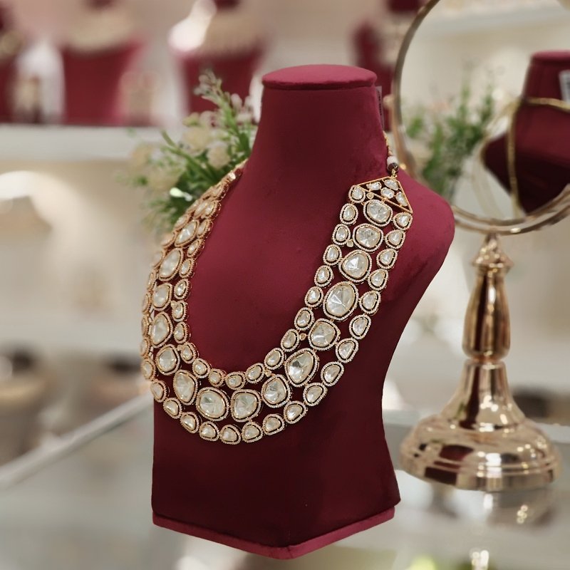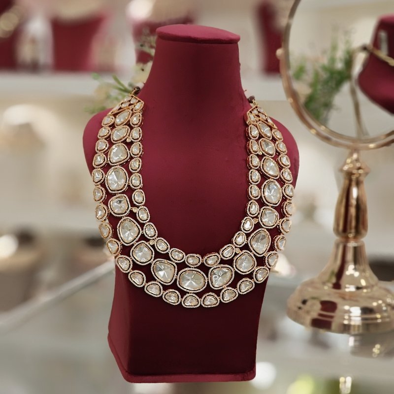 A long 14 kt gold plated statement jewelry set features large polkies and zirconia setting with dangling pieces of a significant size.