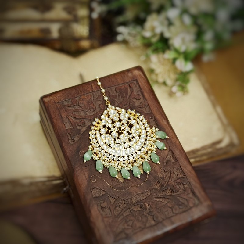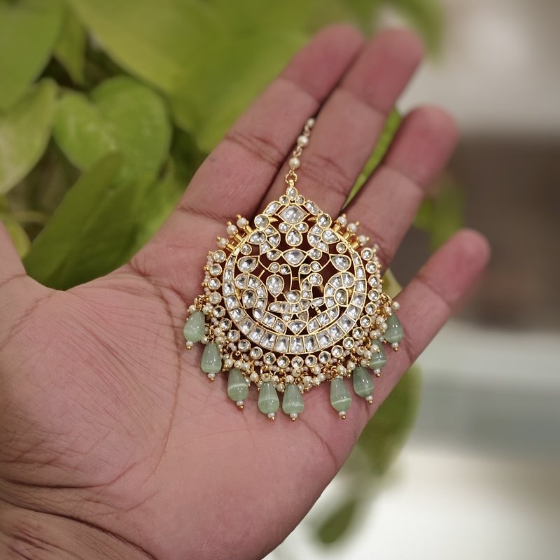 This magnificent maangtikka is crafted in paachi kundan work and mint green beads . It boasts an 22 kt gold plated finish, adding to its exquisite beauty.