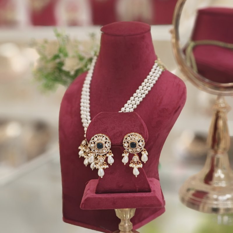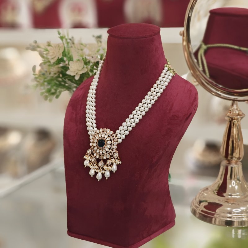 This pendant is of medium length and features stunning blue hydro stones at the center, complemented by moissanite beaded side stones. Delicate strands of pearls delicately hold the pendant in placecomplimented by beautiful pir of studs.
