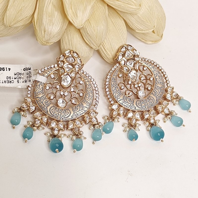 18 kt Gold plated Indo Western Jenny chaandbali , Enameled in Mint green meena and beaded with sea green drop beads .